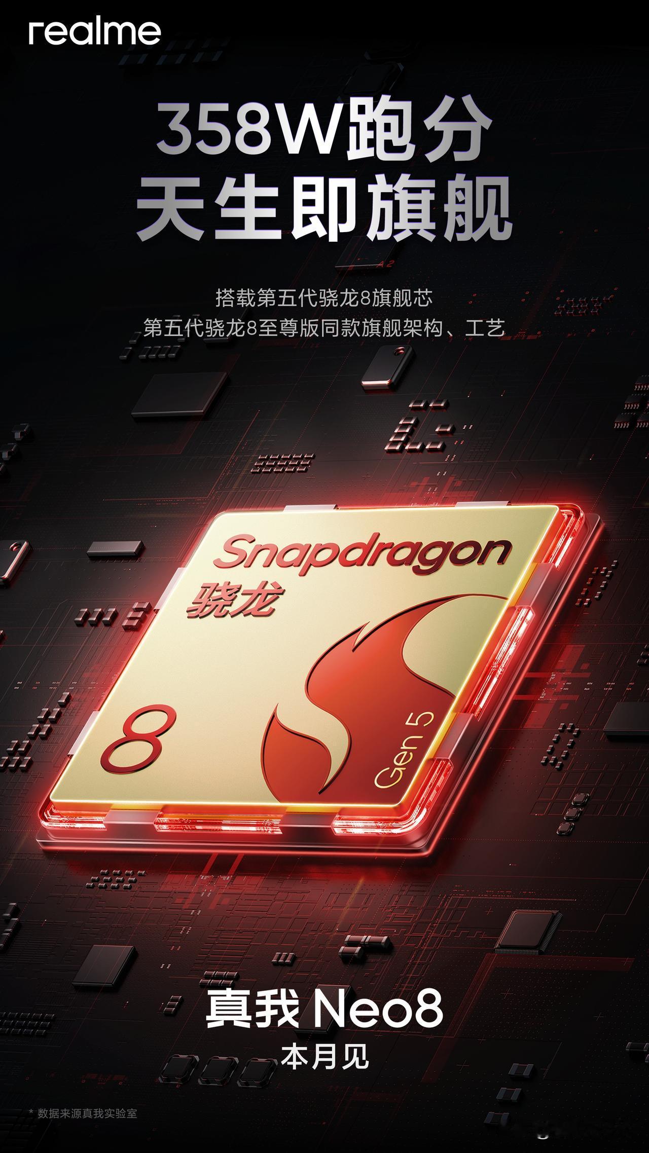 无越级不发布,真我Neo8本月见!新一代潮玩电竞旗舰,性能、设计、体验全面越级。 搭载第五代骁龙8旗舰芯,采用第五代骁龙8至尊版同款旗舰架构与3nm先进制程工艺,358万跑分天生即旗舰,更多越级惊喜敬请期待。