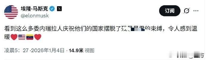 孙少军: 马杜罗被抓了的时候,马斯克居然很开心! 就是刚才,孙少军找到了马斯克最近发的帖子,他看到麻豆罗被抓了之后,在社交网络上非常的活跃,连续发了好多帖子,一会儿老头感到高兴,一会儿自己感动得不得了! 按正常商业逻辑来说,马斯克不是一个商人,或许他和这个地方还有生意往来 ,不知道他为什么和老头一样开心。 老头开心是因为把人家一个国家的老大捉住了,接下来他要接管这个地方,可以说是实实在在的获得了好处。 但是马斯克好像从这件事情上,没有看到他能够获得什么实际性的好处,如果他只是单纯的为老头加油鼓劲,那说明现在他的情商又在往上面长了,因为这个时候他无限的靠近老头,接下来这个地方的业务说不定又会交给他了。 毕竟几千万人口都国家,现在由他们接管了,产生的业务量,可是一个天文数字,马斯克现在和老头刚好关系,随便搞几个业务,应该不是问题。