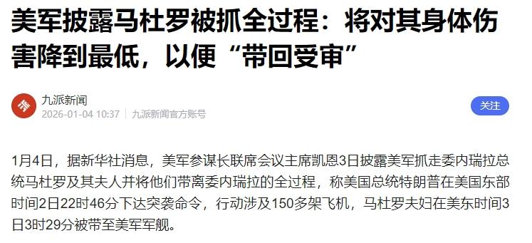 瘦死的骆驼比马大,老美还是有一定实力的,马杜罗就这样在重兵保护下被抓走了。 在1月3日凌晨,美军通过空袭委内瑞拉多个军事和民用目标作为掩护,特种部队在短短三小时内就完成了抓捕任务。 整个过程,与其说是抓捕,不如说更像是一次精准的外科手术,将一个主权国家的首脑直接“摘除”。 军事上的雷霆万钧,掩盖不了其在国际法层面上的蛮横无理,这一行为打开了一个极其危险的“潘多拉魔盒”,国际法的基石之一,便是《联合国宪章》明确规定的主权平等原则。 一个国家未经另一个主权国家政府的同意,派军队进入其领土实施抓捕,这在本质上就是侵略行为,是对该国领土完整和政治独立的公然侵犯。 国际法院在著名的“逮捕令案”中也曾明确,即便是被指控犯有战争罪,在任官员在外国法院面前也享有绝对豁免。 美国方面辩称,他们不承认马杜罗政权的合法性,因此豁免权不适用,但这种单方面的“不承认”就能凌驾于国际法之上吗? 如果这个逻辑成立,那么是不是任何一个强权国家都可以随意定义另一个国家政权的“合法性”,并以此为借口对其领导人采取强制措施? 美国此举的动机,远比其宣称的“打击毒品恐怖主义”要复杂得多,深层原因在于地缘政治、经济利益和意识形态的交织。 自查韦斯时代起,委内瑞拉就高举反美旗帜,与俄罗斯、伊朗等国深化合作,挑战美国在西半球的传统主导地位,这早已让美国如鲠在喉。 特朗普政府将推翻马杜罗视为核心目标,此次行动正是其长期战略的最终图穷匕见。 即便是美国的欧洲盟友,如法国、德国、英国等,在表态时也纷纷强调必须尊重国际法和《联合国宪章》,言语间透露出对这种单边主义行动的不安与复杂心态。 这种反应说明,世界大多数国家都认识到,今天发生在一个南美国家的事情,明天就可能发生在任何一个不顺从强权意志的国家身上。 这种用国内法取代国际法,用单边制裁和军事干预替代对话与协商的做法,正在侵蚀全球治理的根基。 你认为未来国与国之间的交往,是否会因此变得更加猜忌和危险? 信息来源:九派新闻 美军披露马杜罗被抓全过程:将对其身体伤害降到最低,以便“带回受审”