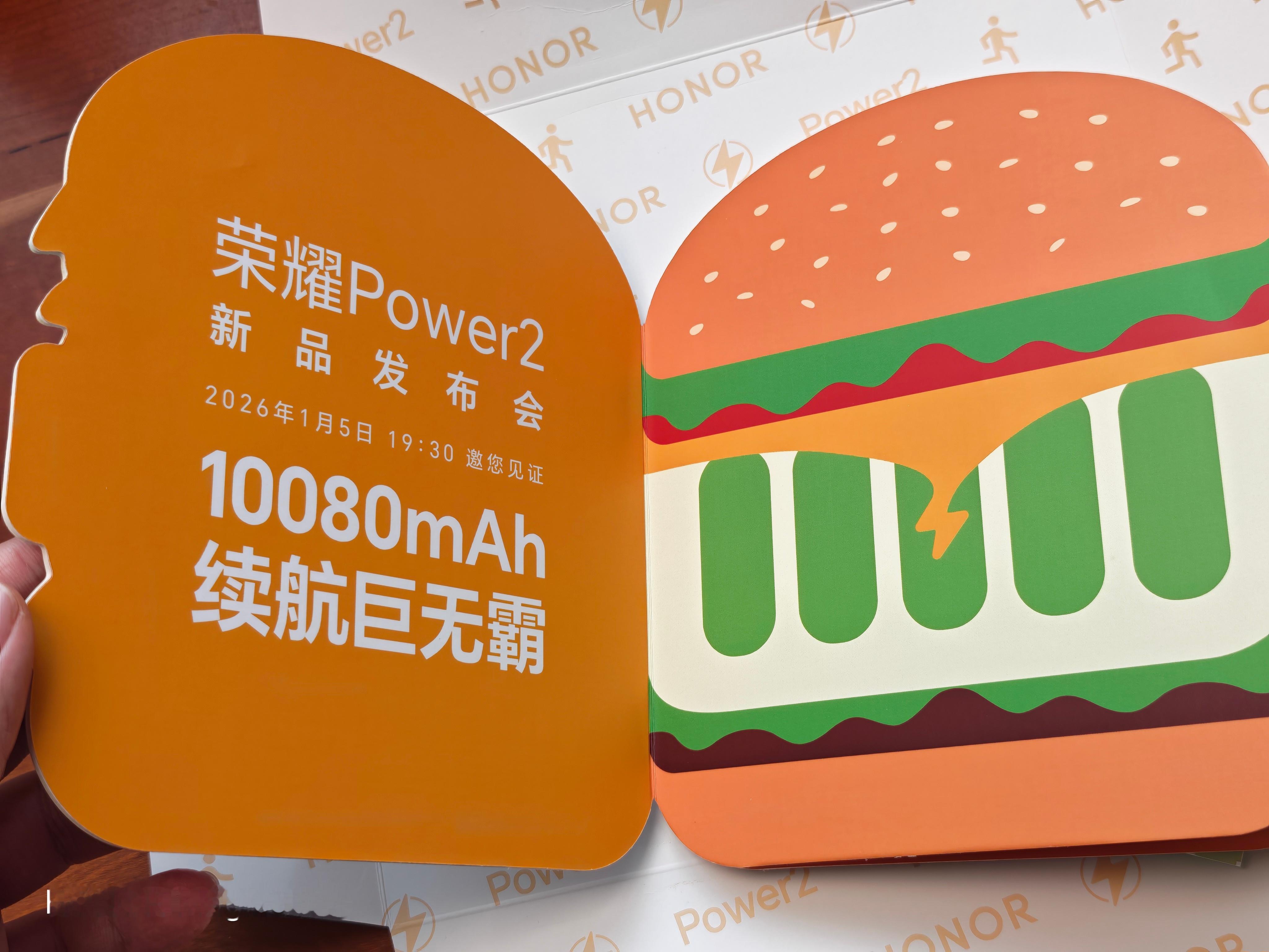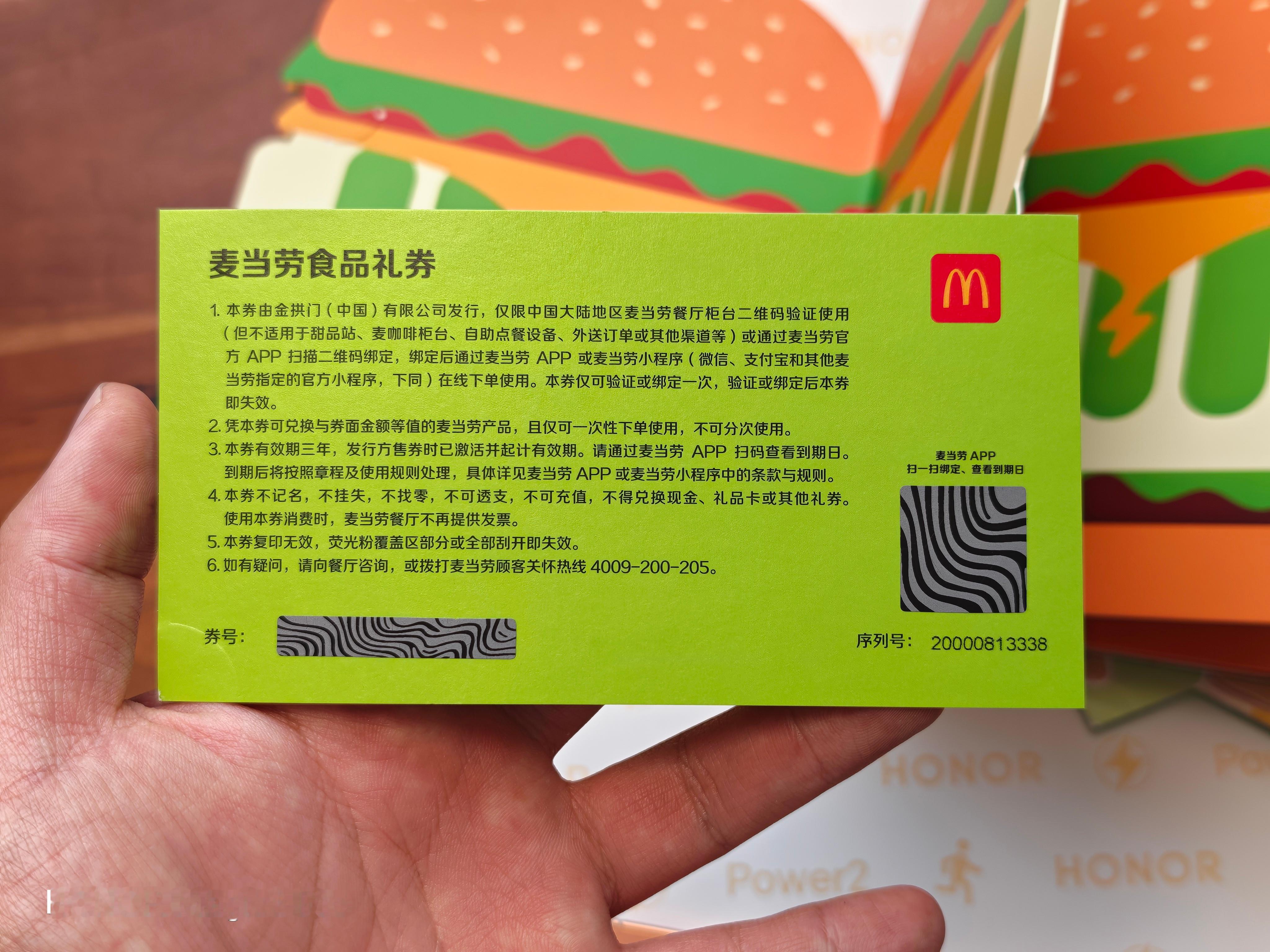 明天是荣耀 Power2 的发布会,然后他们寄来了一个大汉堡的邀请函,里头还有 5 张麦当劳的 20 元礼券一台手机,量大管饱,续航更是人上人!!