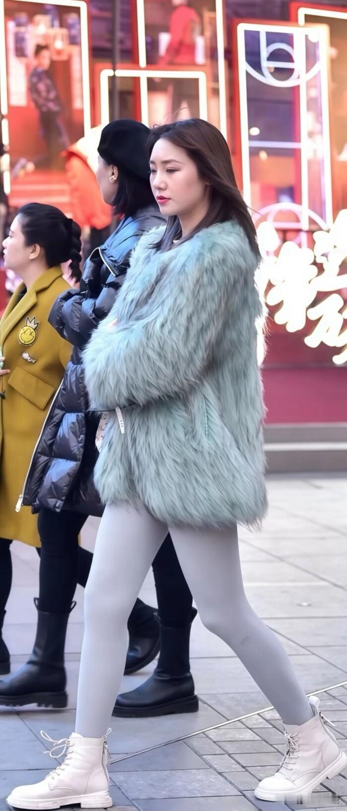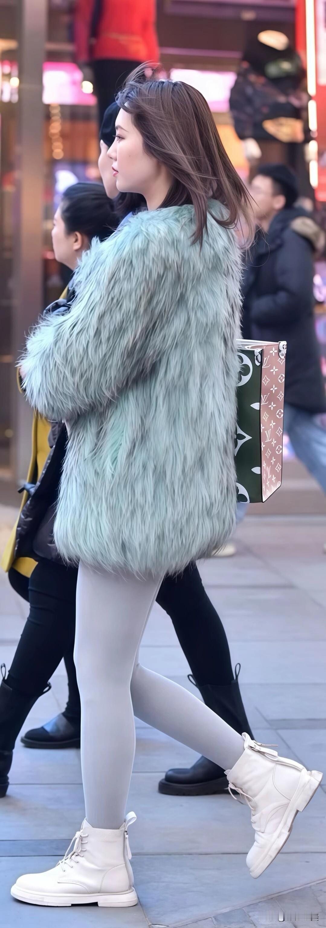 薄荷绿皮草温柔又贵气,浅灰裤装利落,冬日出街范本了~