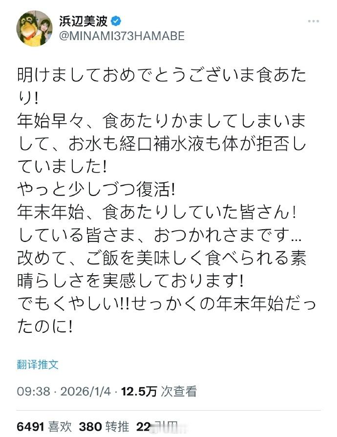 滨边美波自曝食物中毒滨边美波报平安滨边美波自曝新年食物中毒,目前已逐渐好转。