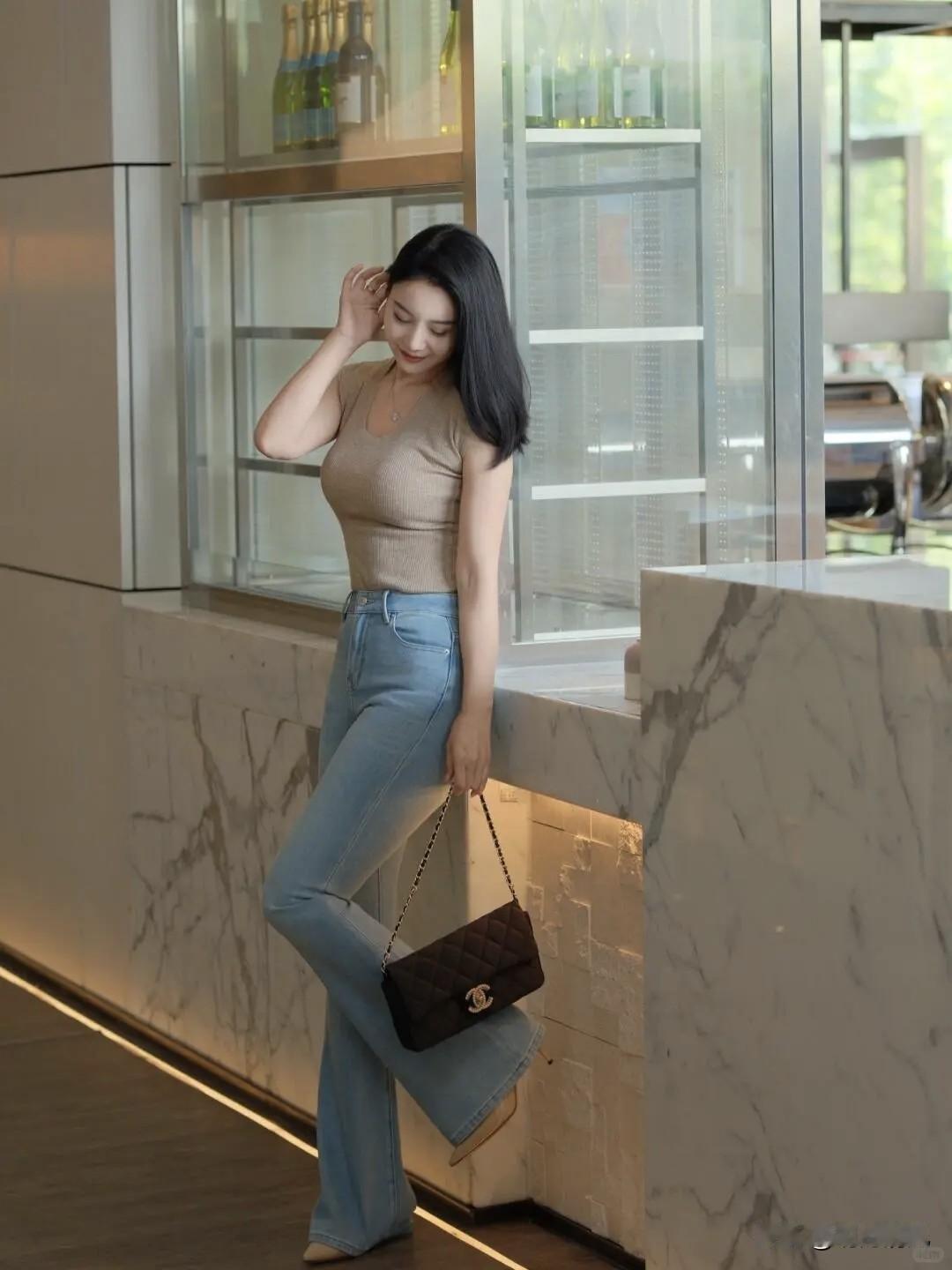 针织衫配喇叭裤是气质标配,但拍照时一不留神就容易显板正,或者身材优点没拍出来。今天这7个动作,就是专门化解这份“端着”感的。 我自己试下来,觉得最不费劲又好用的是 “倚台撩发” 。很简单,身子往大理石台边一靠,一条腿微微交叠到另一条前边,然后顺手撩一下头发就行。这个动作妙在,交叠的腿悄悄就把比例拉长了,撩发时肩膀和颈部的线条也显得特别柔,整个状态就很松弛,完全没有硬摆的痕迹。 另一个 “侧身拎包” 对显身材特友好。侧身对着镜头,把重心移到一条腿上,另一条腿自然放松,手里随便拎个包。你会发现,重心一移,腰线自然就出来了,修身针织衫的优势立马凸显,拍出来特别利落显瘦。 其他的比如走路时自然转身、坐着时托腮抬眸,或者扶着栏杆腿往前伸一点,都是在日常动作里加一点小心思,让画面有支撑、有延伸。关键就是别钉在那儿不动,身体有点倾斜、有点互动,感觉就对了。 你们拍照时有自己的“招牌动作”吗?或者有什么一看就会、一用就灵的松弛感拍照秘诀?来分享一下吧。