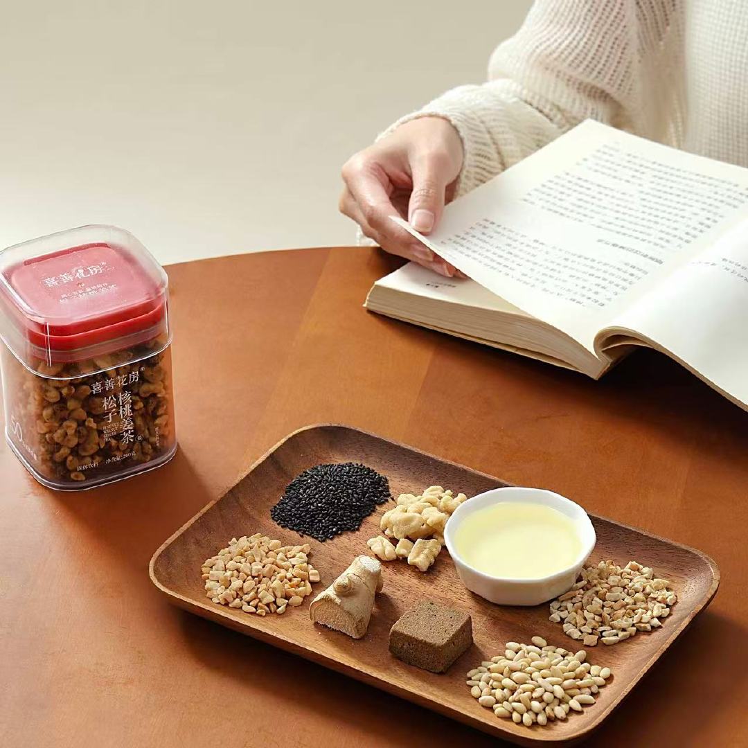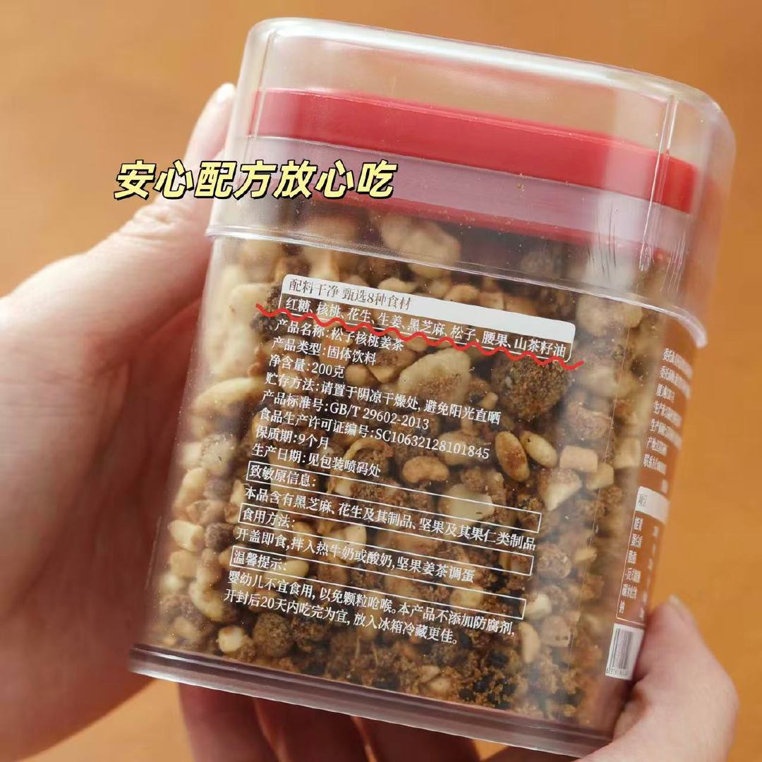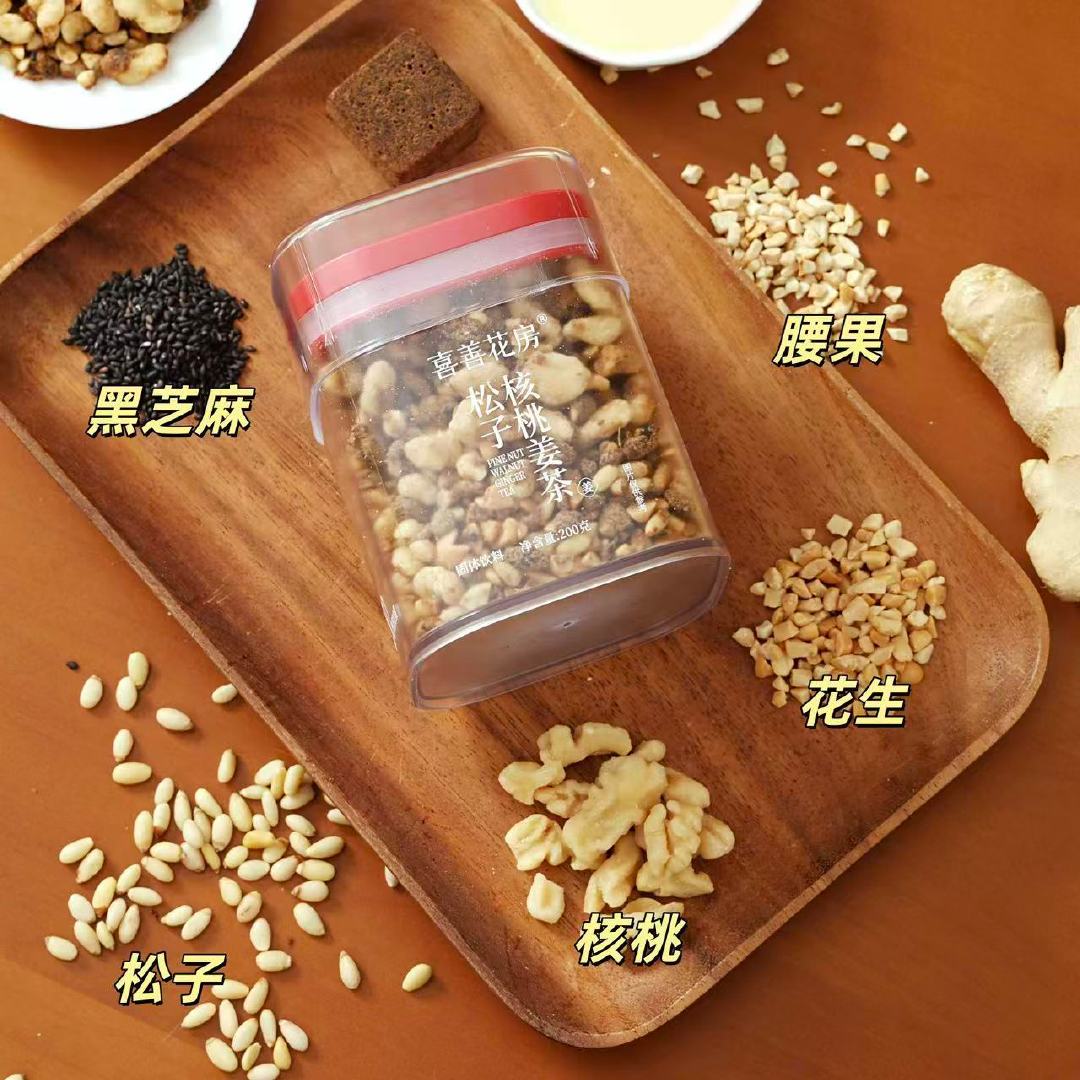 松子核桃姜茶,暖身“小太阳”☀❗驱寒养颜一杯搞定 ❗看得见的大颗坚果❗坚果含量≥50%❗【喜善花房· 松子核桃姜茶】暖身暖心,一口好满足,温润不上火。天气一冷,身体总是先一步“知寒”❄手脚冰凉、肚子不适、早上起不来、脸色发白……其实,身体早在提醒:该补补气血暖一暖了。在温州、台州一带,有一种老配方,是传统月子姜茶方。坐月子都能安心喝的温补配方,日常饮更是暖身不燥,它不是药,却能养气血、驱寒暖胃。那是当地人常备的松子核桃姜茶。一勺入口,甜得不腻,姜香🫚、坚果香🥜、糖香🍬层层叠叠,,喝下去的那一刻,暖意从喉咙一路滑到心底,喝完全身都是元气满满的感觉,平时熬夜🌃、喝冷饮🍦、没精力😴、气温变化🌡就浑身不舒服的,把奶茶、饮料换成它,赶紧喝起来。这款姜茶,来自沿海地区的民间食疗智慧。以姜为引、以坚果为养、以红糖为调,既能补气血,又能温中暖胃。配料表干净得让人安心💖——红糖、核桃、花生、生姜、黑芝麻、松子、腰果、山茶籽油,没有香精、没有防腐剂、没有反式脂肪酸,每一勺,都是实实在在的“好料”。吃法多样,滋养不单调。淡淡的甜、温柔的姜辣、厚厚的坚果香,入口是酥香,回味是暖意。开盖即食:香酥带甜,当作小零食补能量;🥛冲入热牛奶或酸奶:姜香与奶香交织,顺滑浓郁;🥚调入红糖水或打蛋:变成“坚果姜茶蛋”,甜、润、暖。每一种吃法,都有自己的温度。这个好物闭眼入 喜善花房 松子核桃姜茶 冲饮养生茶