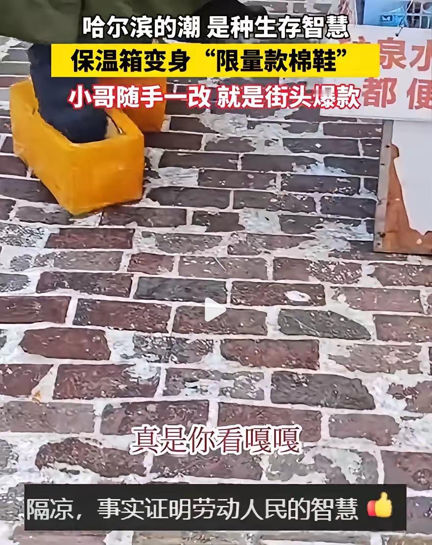 这也太有才了!黑龙江哈尔滨,一名男子逛街时注意到路边一个商户脚下有点不对劲。仔细一看,人家脚上不是棉鞋,也不是靴子,而是两个泡沫箱,后来走近一看,才明白原来是他专门用来保暖的小秘诀 路人瞧着新鲜,凑过去才看清,这泡沫箱被挖了洞,边缘用胶带缠得紧实,刚好能套在脚上,像一双笨拙却厚实的“专属暖鞋”。 摆摊的大哥脚踩这“宝贝”,在寒风里守着自己的小摊,来回挪动时,泡沫箱与地面碰撞出轻微的声响。 有人忍不住上前搭话:“大哥,这玩意儿真能保暖?”大哥咧嘴一笑,声音裹着寒气却透着实在:“咋不保暖?脚底下暖烘烘的,比穿棉鞋还得劲。” 旁人听得啧啧称奇,连夸这是“限量版智慧”,大哥只是摆摆手,继续低头整理自己的货物。 不少人纳闷,泡沫箱咋就能保暖?说穿了,不过是利用了最朴素的道理。泡沫里藏着无数空气,空气导热慢,既能挡住外头的寒气,又能锁住脚上的热量。 更妙的是,脚踩泡沫箱,离了冰冷的水泥地,地面的寒气便少了几分侵袭。这原理,和羽绒服锁温、保温杯保热,本是同出一辙。 这双“泡沫鞋”,不好看,不名贵,却是底层人在寒风里的生存法宝。北方的冬天,摆摊、站岗的人最懂脚冷的滋味,那是从骨头缝里往外钻的寒。 商场里的保暖鞋固然暖和,可价格摆在那里,坏了脏了,都叫人心疼。泡沫箱却不同,坏了就换,几无成本,用起来毫无顾忌。 这世间最管用的法子,往往都带着几分“不体面”。它们不是设计师的灵感迸发,而是被寒风、被生计,一点点逼出来的应对之策。 我总觉得,这种智慧比花钱买东西更可贵。不用复杂的工具,不必昂贵的材料,只是把身边最普通的物件用到极致,便解了燃眉之急。 生活从不会亏待肯动脑子的人,这份在困境里找办法的本事,才是最值钱的财富。