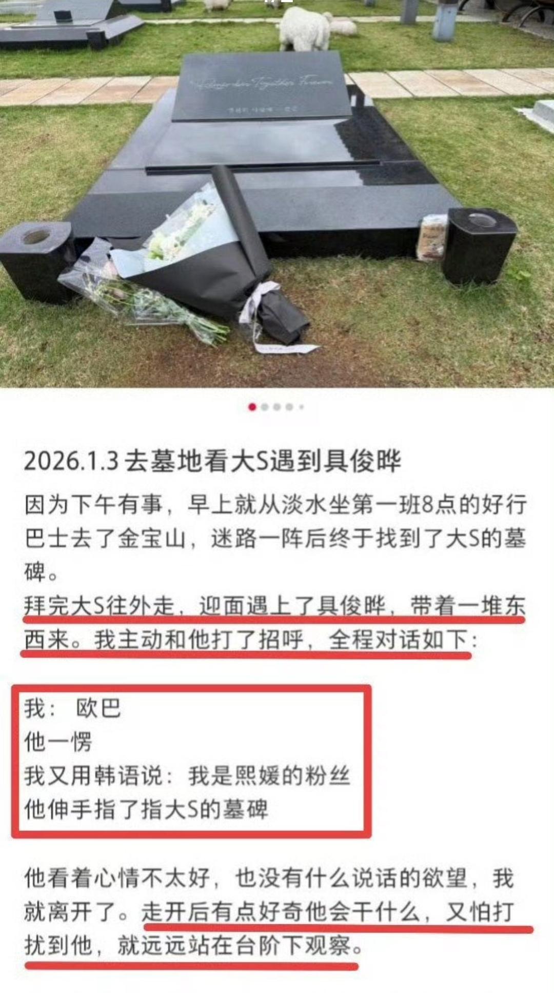 1月4日具俊晔又去墓地“陪伴”大S了,擦墓碑擦得那叫一个专注,折叠椅都没打开!咱就想问,是真思念还是摆拍啊? 之前就被拍到带平板放《流星花园》、带她爱吃的食物,现在又来这出“擦碑不坐椅”的戏码,怎么看都像钻牛角尖,太执拗了。 人活着要向前看,像具俊晔这种隔三差五就来这么一套。 别说是大S家人看着难受,就是大S在天有灵,看着也心里不舒服啊。
