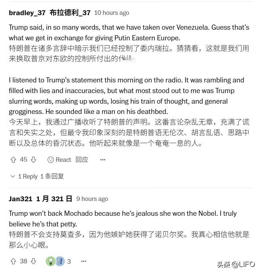 现在民主党正在疯狂哈气。几个民主党议员都公开表达了对特朗普不支持马查多的不满。所