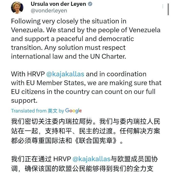 欧盟委员会主席冯德莱恩出来表态了!1月3日,冯德莱恩表示,欧盟正密切关注委内瑞拉局势。欧盟坚定站在委内瑞拉人民一边,支持以和平、民主的方式实现政权过渡。 现在委内瑞拉局势真的是成为全球焦点,欧盟委员会主席、外交与安全政策高级代表、欧洲理事会主席三方高官几乎同时发声,态度一致又各有侧重,瞬间引发外界热议。 最先释放信号的是欧盟委员会主席乌尔苏拉·冯德莱恩,她没有选择常规的官方发布会,而是直接在社交媒体上发布声明,声明里把立场摆得很明确,欧盟正紧盯着委内瑞拉局势的每一个变化,不会坐视不管。 冯德莱恩特意强调,欧盟坚定站在委内瑞拉人民一边,她明确表示,支持通过和平、民主的方式解决当前的局势问题,实现政权的平稳过渡,任何解决方案都不能脱离国际法和《联合国宪章》的规定,这是底线问题。 她还提到,自己正在和欧盟外交与安全政策高级代表卡娅·卡拉斯保持密切沟通,同时协同欧盟各个成员国,确保欧盟的立场和行动保持一致,这一番表态,既亮明了态度,也透露了欧盟内部正在紧密协调。 几乎在冯德莱恩发声的同时,卡拉斯也通过社交媒体给出了回应,作为欧盟负责外交和安全的核心人物,她的表态更偏向实际行动层面,她直言已经和美国国务卿鲁比奥通了电话,也联系了欧盟驻委内瑞拉大使。 欧洲理事会主席安东尼奥·科斯塔也没缺位,他认为,所有解决方案都必须建立在充分尊重国际法的基础上,欧盟会继续支持委内瑞拉寻求和平、民主且包容的解决路径。 三方高官同步发声,这种情况并不常见,这也能看出,欧盟对委内瑞拉局势的重视程度,不过仔细琢磨就能发现,欧盟的表态看似强硬,实则留足了余地,没有直接指责任何一方,更多是在呼吁克制和遵守规则。 除了欧盟核心层,不少欧盟成员国也跟着亮明了态度,法国的反应最直接,外交部长巴罗明确表示,当前针对委内瑞拉的军事行动,违背了国际法不使用武力的基本原则。 巴罗的话说得很直白,任何持久的政治解决方案都不能由外部势力强加,一个国家的未来,只能由这个国家的主权人民自己决定,法国会一直遵循《联合国宪章》的规定,这一原则在任何时候、任何地方都不能被打破。 英国的表态则相对谨慎,首相斯塔默明确说,英国没有以任何方式参与相关军事行动,被问到是否会谴责时,他表示当前首要任务是核实事实,等把情况弄清楚了再做判断,但英国一贯主张维护国际法。 欧盟及成员国的这些表态,看似五花八门,其实核心诉求很一致,都是希望局势能降温,通过和平方式解决问题,并且要尊重国际法的基本准则,这种一致性,也体现了欧盟在国际事务中维护现有国际秩序的立场。 有人可能会疑惑,欧盟为什么这么重视委内瑞拉局势。 须知,委内瑞拉乃重要能源出口国,欧盟诸多国家与其存有经济往来。局势动荡不仅会危及能源供应,还可能诱发难民潮等连锁反应,最终损及欧盟自身利益。 更关键的是,当前国际社会对国际法和国际秩序的认同面临挑战,欧盟一直把维护现有国际规则当作重要目标,这次委内瑞拉局势正好是一个关键节点,欧盟主动发声,也是在向外界传递信号,不能任由单边行动破坏国际秩序。 不管是欧盟核心层的同步表态,还是各成员国的差异化回应,都能看出国际社会对和平解决争端的期待,武力从来都不是解决问题的最佳方式,只会带来更多的动荡和伤亡,最终受苦的还是普通民众。 大家对此有什么看法呢?欢迎各位在评论区留言!