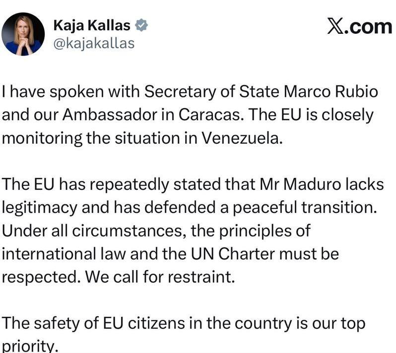 【果然很欧盟】 欧盟外交与安全政策高级代表卡拉斯表示,欧盟曾多次声明马杜罗政权不具合法性,并主张通过和平方式实现政权过渡。 卡拉斯透露已与美国国务卿鲁比奥通电话,呼吁各方保持克制,同时提醒无论在何种情况下,都必须恪守国际法原则与《联合国宪章》的规定。 她一边重申马杜罗政权不具合法性,一边与美国国务卿鲁比奥通话呼吁“各方保持克制”,强调要恪守《联合国宪章》。 这就让人有些不懂了,美国这般强盗作为,你不批,反而呼吁各方遵守联合国宪章规定,是左右脑互搏了吗? 2024年委内瑞拉的总统选举说起,当时反对派候选人玛丽亚·科里娜·马查多被委内瑞拉最高法院取消参选资格,欧盟议会认为这一决定没有法律依据,还谴责马杜罗政权干预选举进程、迫害反对派人士。 欧盟此前和委内瑞拉政府及反对派在巴巴多斯签署过协议,约定要举行自由公正的选举,可他们觉得马杜罗政权没遵守这份协议,所以坚决不承认2024年的选举结果。 除此之外,马杜罗执政这些年,委内瑞拉经济状况确实糟糕,曾经的石油富国因为各种原因,石油日产量从300万桶暴跌到不足100万桶,通胀一度飙升到百万百分比,民生困顿让欧盟找到了更多不承认其合法性的理由,在他们看来,这样的政权自然需要“和平过渡”到所谓的“民主状态”。 可另一边,美国的所作所为完全是另一副模样。这次军事行动连联合国安理会授权都没有,直接跨境抓捕一个主权国家的在任总统,明眼人都能看出来这是对国家主权的公然侵犯,完全符合国际法意义上的“侵略”定义。 美国给行动贴的“司法行动”标签根本站不住脚,即便真对马杜罗有指控,也该通过国际司法程序解决,而非动用武力。 其实美国的真实意图早就藏不住了,委内瑞拉是世界上已探明石油储备最丰富的国家,特朗普之前就直言要“夺回属于美国的石油和土地”,这次行动不过是为了掠夺资源、巩固区域霸权的幌子。 欧盟明明看到了这一点,却偏偏不直接批评美国,反而模糊地呼吁“各方克制”,核心原因还是自身的利益考量和立场纠结。 欧盟和美国是传统盟友,在意识形态和很多国际议题上都保持一致,自然不想因为委内瑞拉问题和美国彻底闹僵。 但同时,欧盟又很看重国际法和《联合国宪章》构建的国际秩序,毕竟如果“跨境抓捕他国元首”的先例被默许,未来任何中小国家都可能面临风险,这不符合欧盟长期的安全利益。 委内瑞拉境内有欧盟公民的安全需要保障,欧盟在当地也有经济利益牵扯,直接谴责美国对他们没好处,所以只能用这种“和稀泥”的方式表态,既不得罪美国,又能维持自己“重视规则”的形象。 不过欧盟的这套说辞根本站不住脚。 《联合国宪章》明确规定禁止使用武力侵犯他国领土完整和政治独立,美国的行为已经严重违反了这一核心原则,此时最该被要求“克制”和“遵守规则”的就是美国。 欧盟一边否认马杜罗政权的合法性,一边对美国的侵略行为避重就轻,本质上还是在霸权逻辑和规则诉求之间找平衡,可这种平衡最终只会让国际法沦为选择性执行的工具。 事实上,委内瑞拉的问题终究该由委内瑞拉人民自己解决,不管是政权更迭还是发展道路选择,都轮不到外部势力用枪炮指手画脚。 国际社会真正该做的,是谴责美国的霸权行径,而不是借着“合法性”争议为侵略行为张目。欧盟的模糊表态不仅难以服众,反而暴露了其在国际事务中既要依附美国又想保持独立姿态的尴尬处境,这样的“左右互搏”,最终只会损害自身的国际信誉。