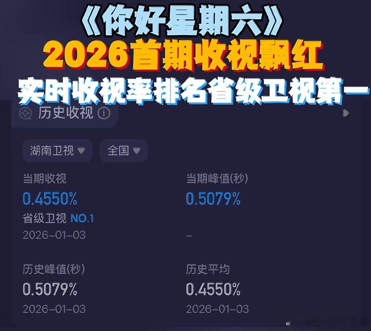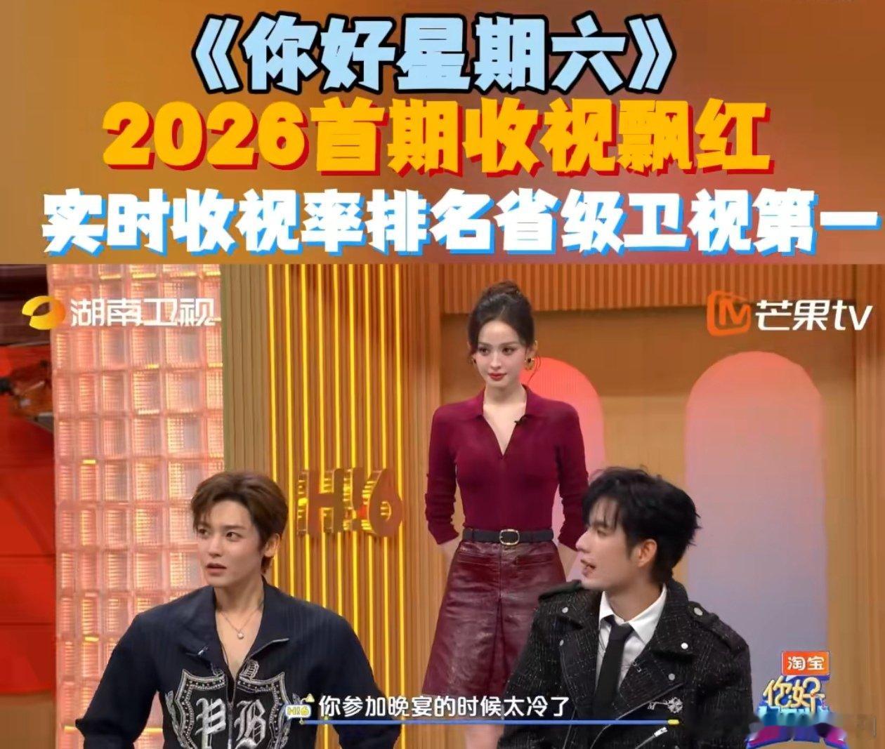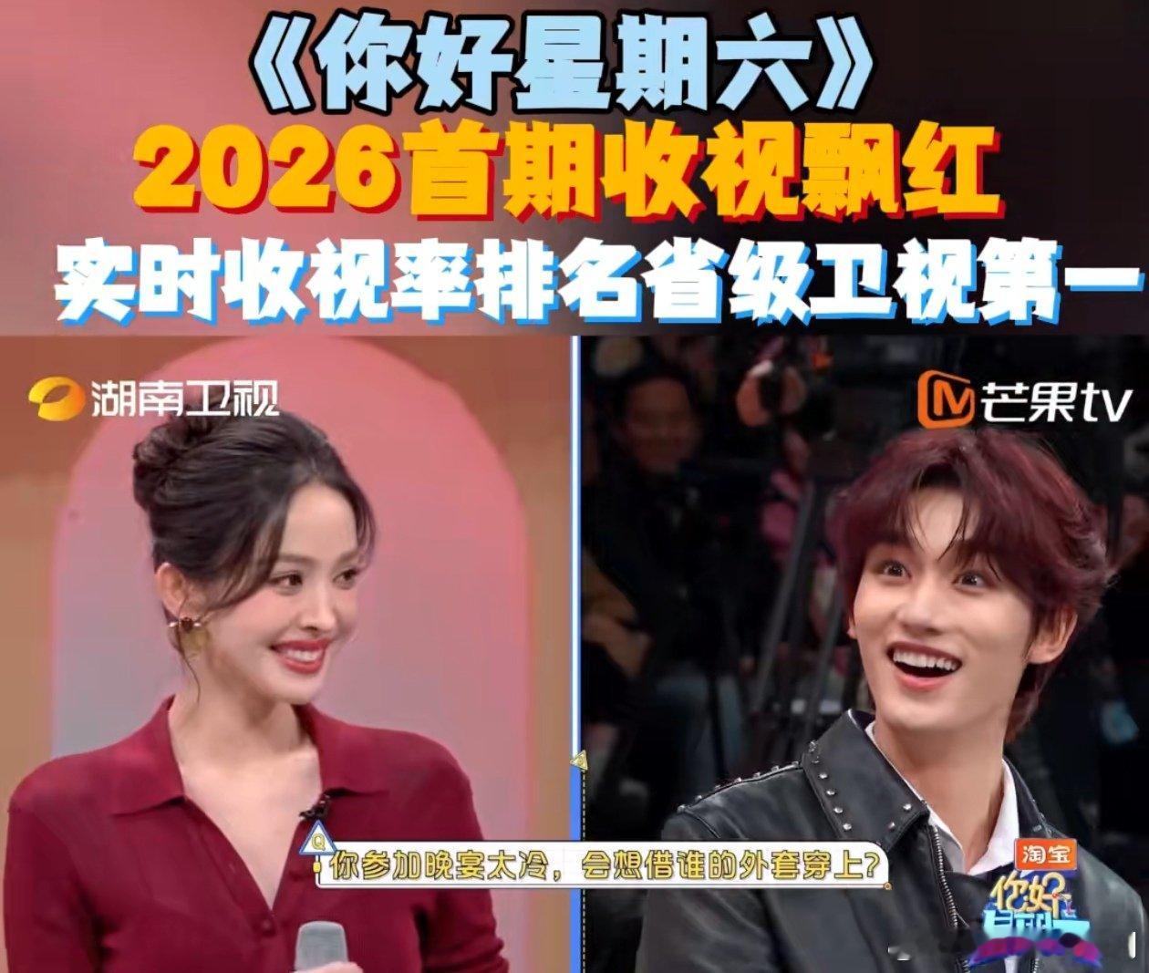 好六新年首期收视第一 恭喜好六!新年首期收视夺冠,这成绩太出色。节目精彩质量佳,观众追得过瘾。何炅老师和嘉宾辛苦啦,下期欢乐再临!你好星期六你好星期六