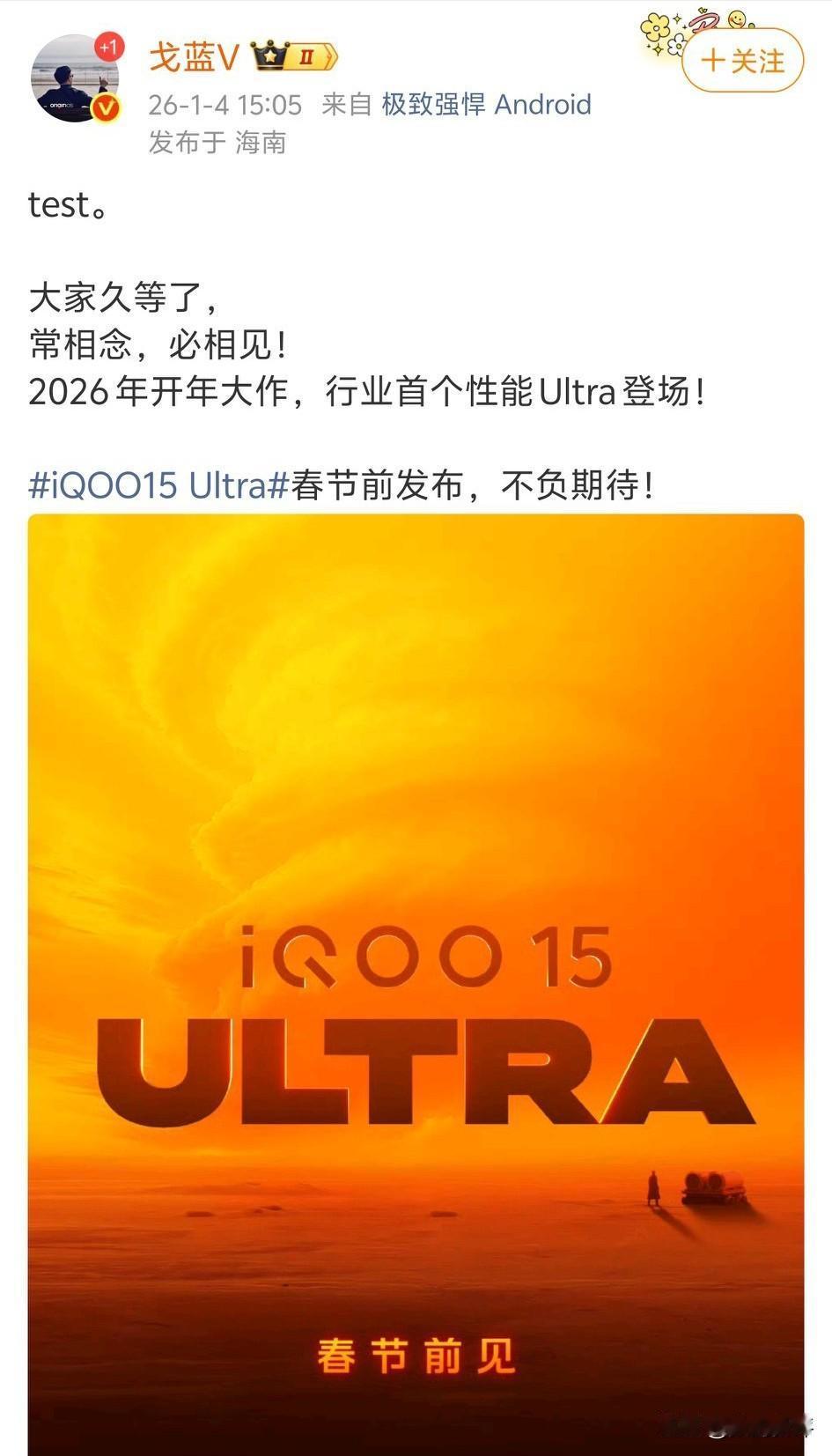 iQOO15Ultra官宣了!年前新机确实多!可能想在春节期间有波小高峰吧,有希望增加销量[思考]iQOO15Ultra对比标准版性能释放更强,其他方面估计没什么变化,爆料有内置风扇和游戏肩键,如果电池容量拉到7500毫安左右,主摄换成两亿像素主摄,那么整体对比iQOO15就很全面了!