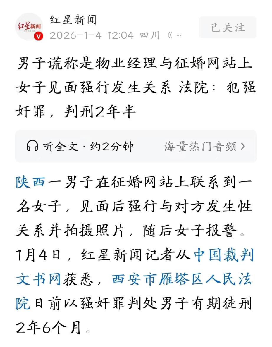 判的太轻了!陕西西安,37岁无业游民没钱没对象,他在婚恋网上看到一女子信息,瞬间动了歪心思,不仅约女子见面,还以送她回家为名跟到了女子的出租屋里。男子将自己伪装成一名成功人士,谎称自己是物业经理,月入过万,名下有两套房,要是女子跟他结婚,马上给她一套房。见女子态度松动,男子趁机强行与女子发生关系,过程中还拍摄视频并殴打女子。事后,女子报警,男子悲剧了。 37岁的男子吉某要学历没学历,要能力没能力,没有稳定的工作,是个正儿八经的无业游民 手里没钱,自然也没对象,看着别人有车有房,儿女双全,他除了羡慕嫉妒,只能干着急。 2025年2月10日,吉某在征婚网站上瞎逛,突然就看到了女子王某的信息,王某不管从长相,还是个人喜好,都是他喜欢的类型,而且,跟他同城。 于是,他赶紧留下王某的联系方式,当天下午5点多,就迫不及待地约王某见了面。 他知道,按照他的真实条件,王某肯定看不上他,现在的女孩子,最基本的要求就是有房有车,或者有份体面赚钱的工作。 所以,见面之前他就做好了准备,不但从头到脚给自己收拾了一番,还精心给他打造了一个成功人设。 见完面后,晚上8点多,吉某又以送王某回家的借口,跟随王某来到了她的出租屋。 为了尽快拉紧两人关系,一进屋,他就开始吹嘘起来,讲述自己虚构的光鲜亮丽的背景。 他一本正经地告诉王某,自己是某小区的物业经理,月入过万,名下还有两套房。 接着,他开始表达对王某的爱意,还拍着胸脯保证,要是两人结婚,就把其中一套房子留给王某的孩子。 一开始,王某还有点将信将疑,这年头,还有这么好的男人吗? 可架不住他说得天花乱坠,有鼻子有眼的,很快,王某就信以为真了。 吉某看王某态度有所松动,知道时机已经成熟,便趁热打铁,提出要和王某发生关系。 好在王某还有点理智,知道这才第一次见面,对他完全不了解,立马明确表示了拒绝。 可上头的吉某哪管这些,他一心想着,到手的肥肉可不能就这么没了,于是,失去理智小他不管王某愿不愿意,仗着自己力气比王某大,强行将王某按住。 王某又惊又怕,拼命用手推吉某,还扇了他好几个巴掌,并大声呼救。 但两人力量悬殊,王某还是被侵犯,过程中,吉某竟然还掏出手机拍摄视频。 王某用手和胳膊一个劲儿的阻拦,吉某恼羞成怒,对着王某的头和脸就是一顿殴打。 事后,王某没有忍气吞声,马上报了警。 次日,吉某就被警方传唤到案。他自知自己犯了大错逃不过,所以如实供述了自己的犯罪事实。 《刑法》第236条规定:以暴力、胁迫或者其他手段强奸妇女的,处三年以上十年以下有期徒刑。 本罪的核心是违背妇女意志,以暴力、胁迫等手段强行发生性关系。 本案中,吉某虚构物业经理、月入过万、两套房等身份,以结婚赠房为诱饵,属于欺骗型的其他手段,使王某陷入错误认识而放松警惕,为后续暴力侵犯创造条件。 王某明确拒绝发生关系,吉某却强行按压、殴打并侵犯,完全违背其意愿;过程中还拍摄视频、暴力殴打,属于典型的暴力手段,符合客观要件 。 此外,吉某具备刑事责任能力,主观上明知违背王某意志仍强行发生关系,直接故意明显,完全符合强奸罪的主观要件。 不过,依据《刑法》第67条:犯罪嫌疑人虽不具有前两款规定的自首情节,但是如实供述自己罪行的,可以从轻处罚。 吉某被警方传唤到案后,如实供述全部犯罪事实,构成坦白,依法可从轻处罚。 综上,法院最终判处吉某有期徒刑2年6个月。