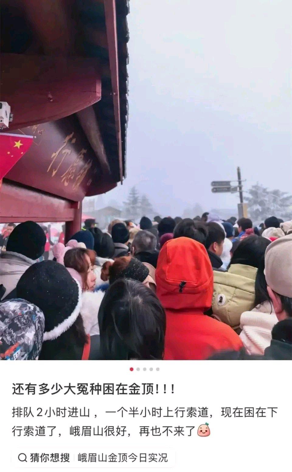 没见过这么离谱的!近日陕西太白山和四川峨眉山景区双双被挤爆,数百游客深夜在零下20℃的环境下滞留。就说峨眉山,1月1日起寺院免费开放,1月2日就出状况了。有女游客9点到游客中心,坐观光车堵到想哭,20分钟的路走了1小时。到索道入口排队1小时上金顶,打卡后赶紧去排下山索道,零下4度的气温下,排了3小时才下山,一整天游玩仅半个多小时。还有游客因个子矮挤在中间,呼吸都不畅。景区这管理,真让人一言难尽!
