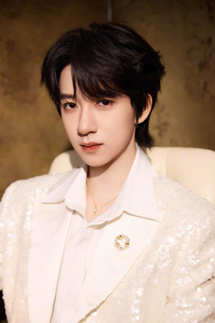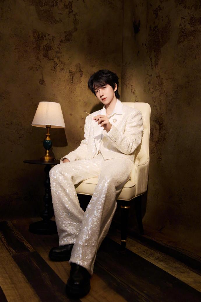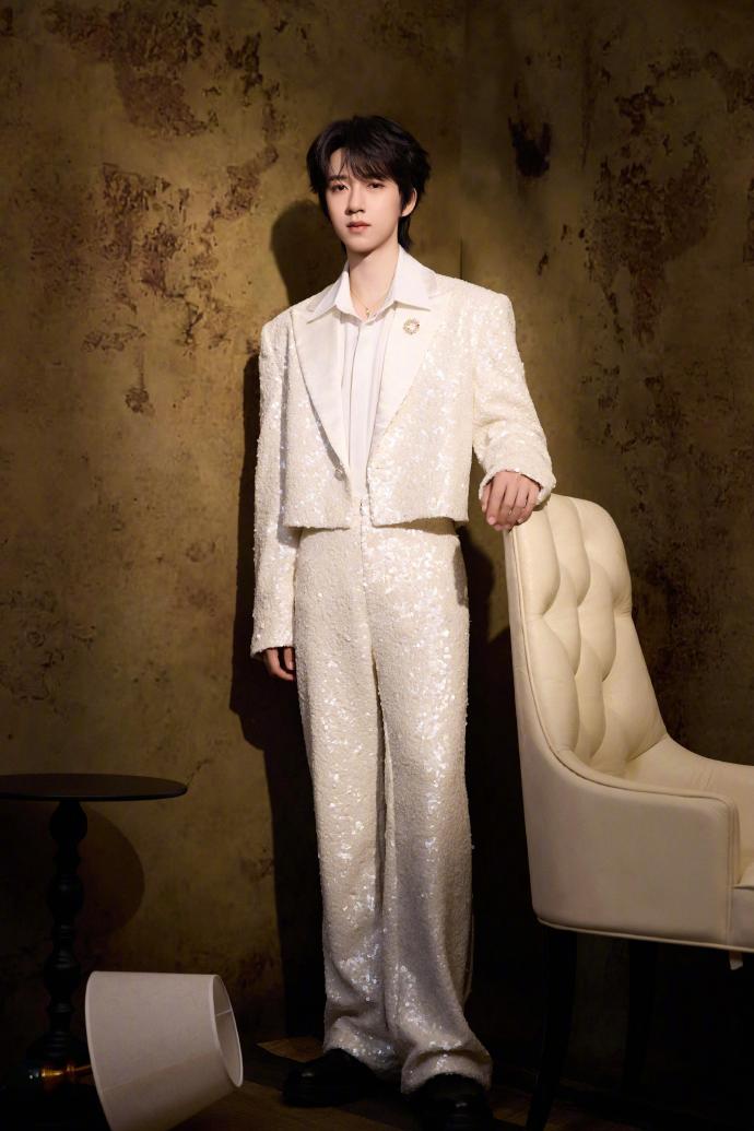 贺峻霖出席王者荣耀赛事决赛造型,身着短款戗驳领亮片套装搭配白衬衫,佩戴御木本MIKIMOTO珠宝,贵气闪耀,满满冬日白色恋人感