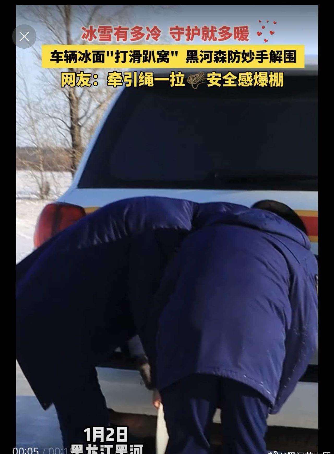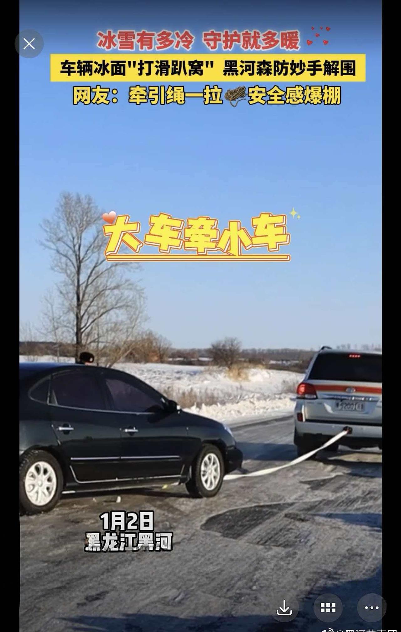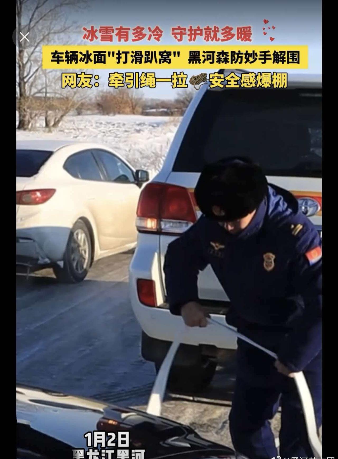 黑河市森林消防支队外出遇冰面受困车辆,即刻伸出援手,冰面作业,牵引绳一拉,大车拽小车,稳稳“上岸”!寒风再烈,也抵不过黑河温度~极寒试车燃动黑河试车名城魅力黑河冰临黑河玩转中俄