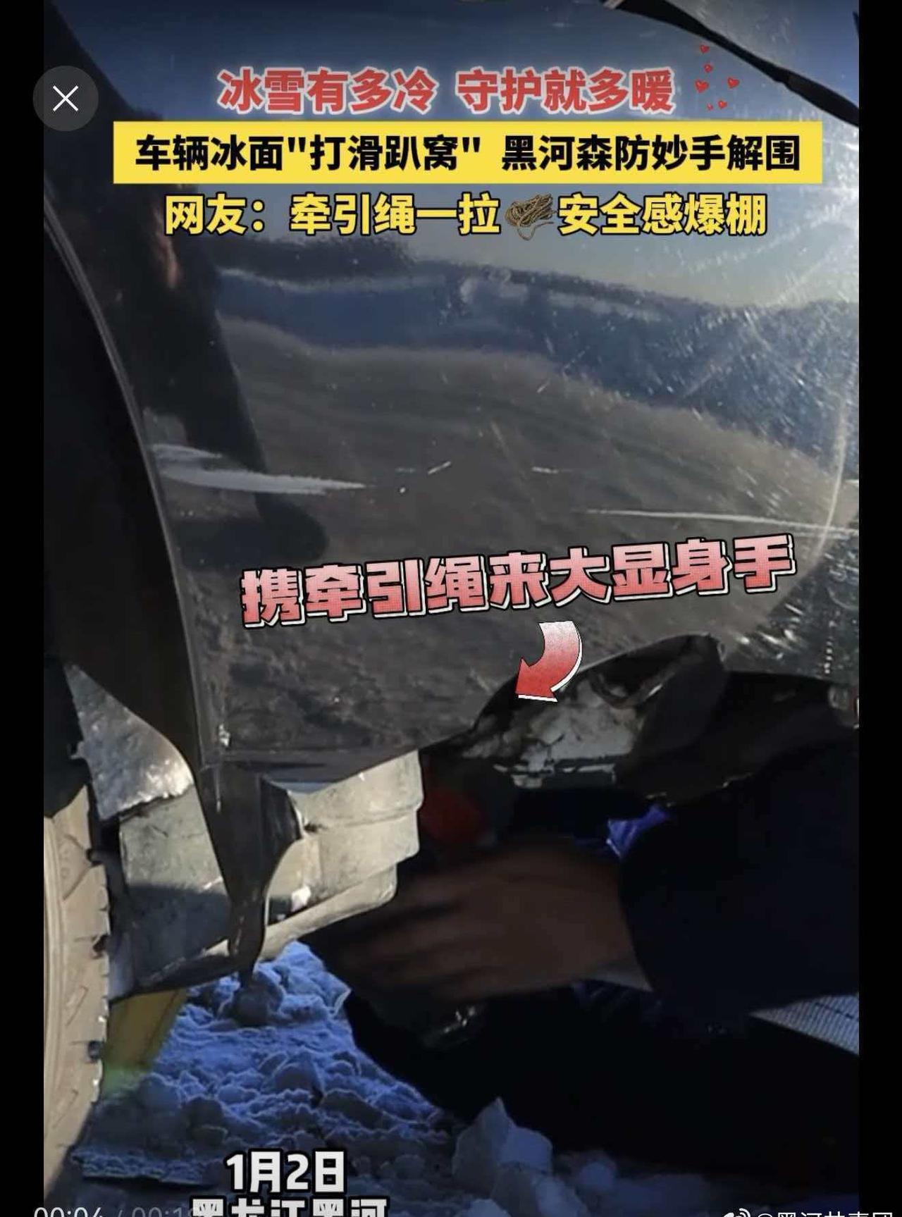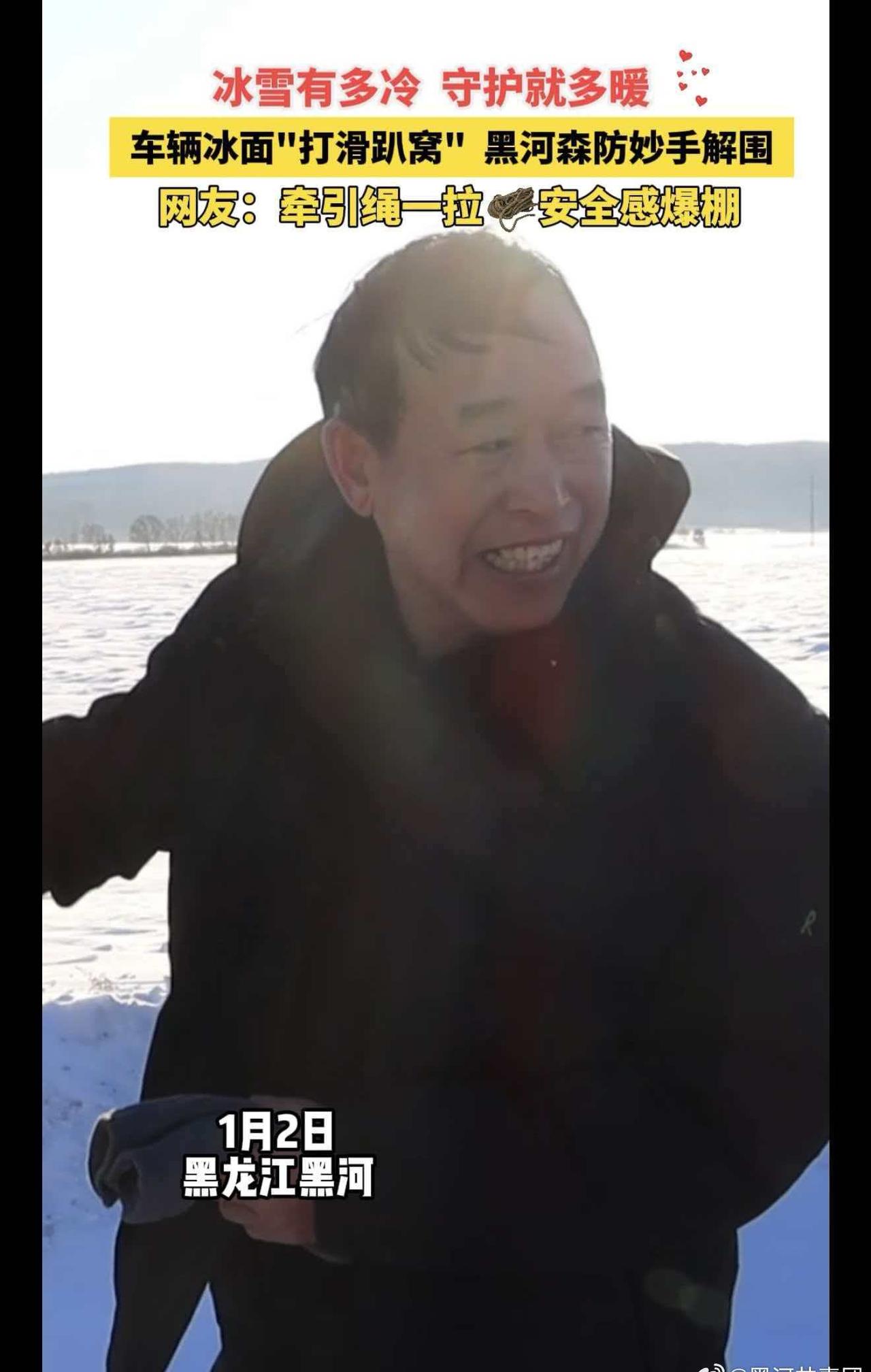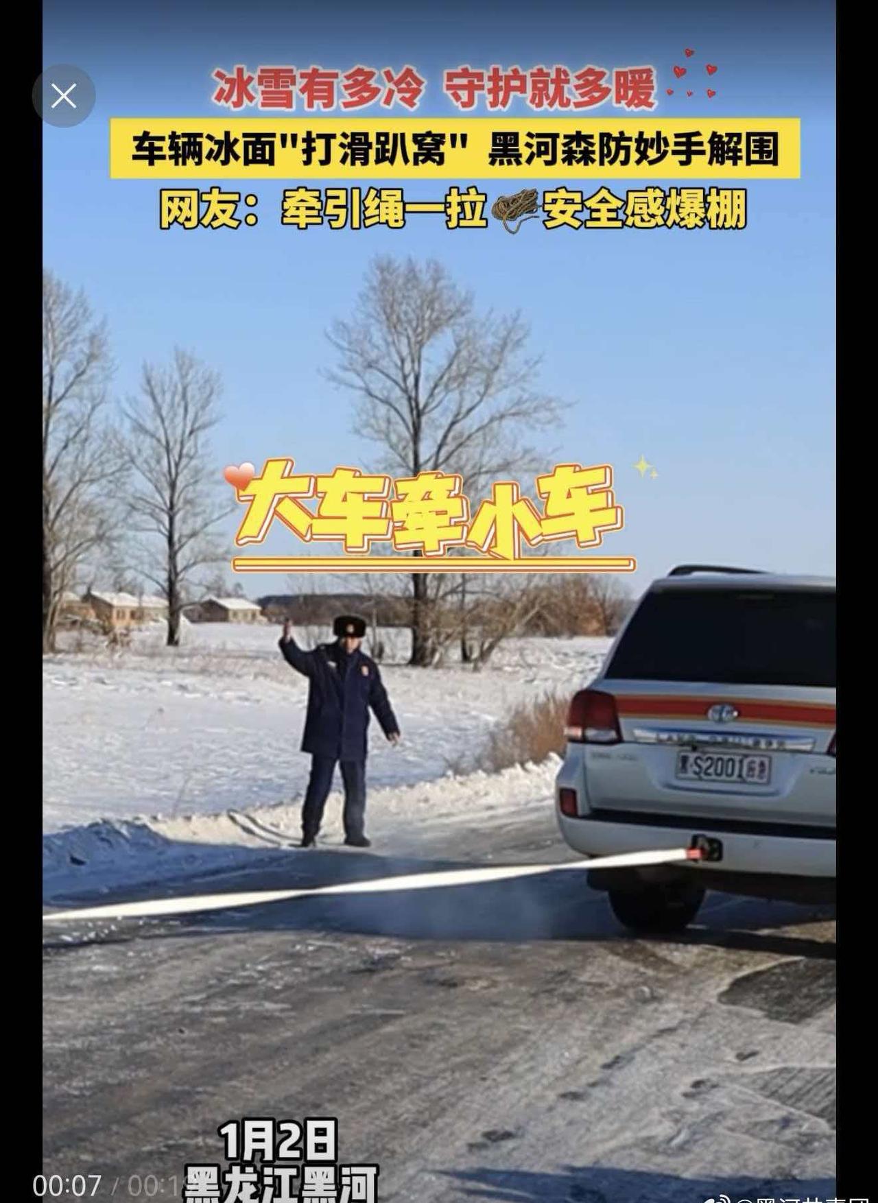 黑河市森林消防支队外出遇冰面受困车辆,即刻伸出援手,冰面作业,牵引绳一拉,大车拽小车,稳稳“上岸”!寒风再烈,也抵不过黑河温度~极寒试车燃动黑河试车名城魅力黑河冰临黑河玩转中俄