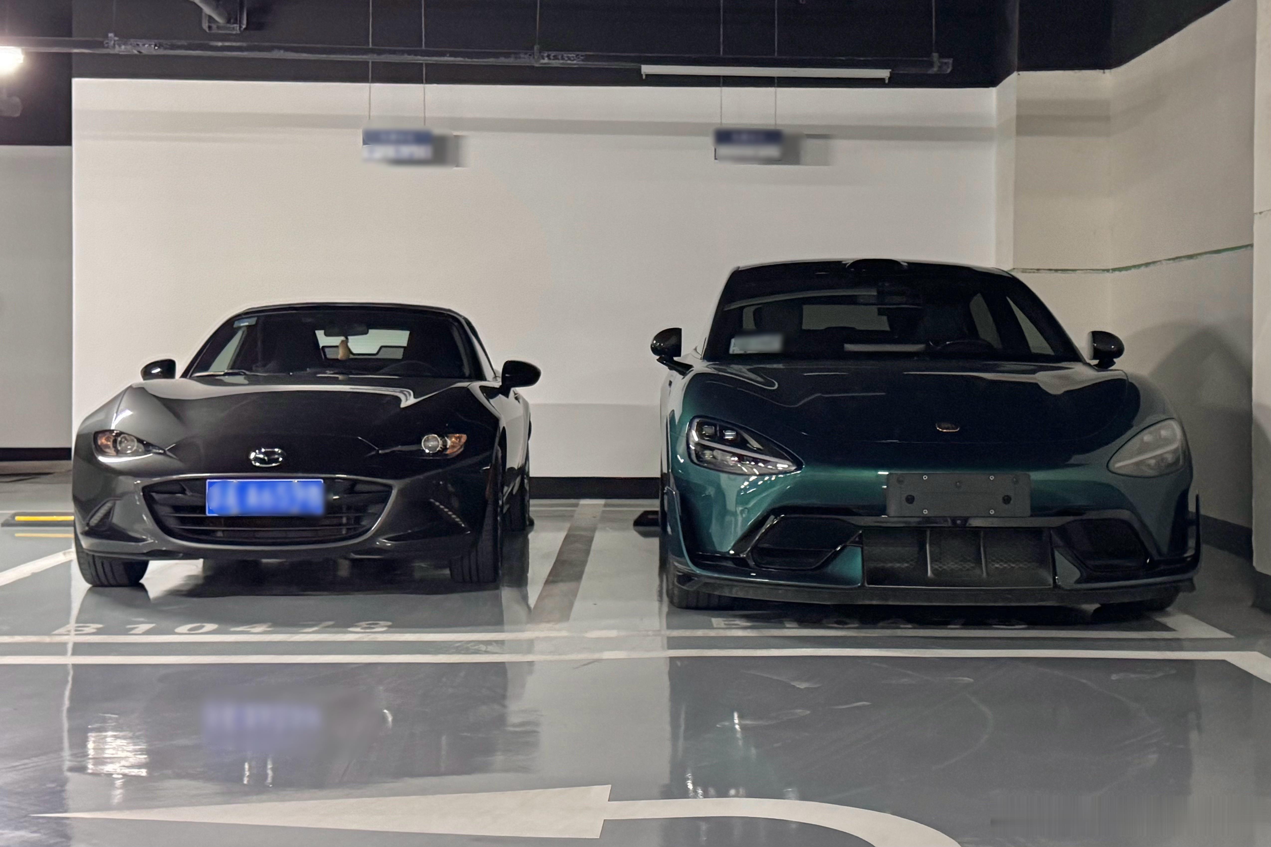 回北京了,晚上把mx5和小米SU7 Ultra停在了一起,俩车后轮都顶在限位器上,下车看了半天…这俩体型差距居然这么大???!!这台车可以说是两个完全不同的时代、市场、文化、需求,对于性能车完全不同的理解,此刻在我地库里对撞了。我一直认为一台车不止工业产品那么简单,背后更是社会、人文、时代的体现。凯文聊车马自达mx-5小米su7ultra