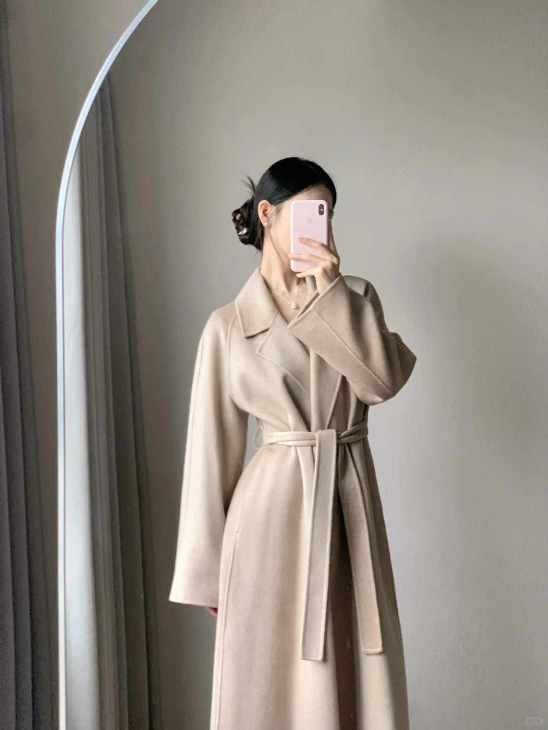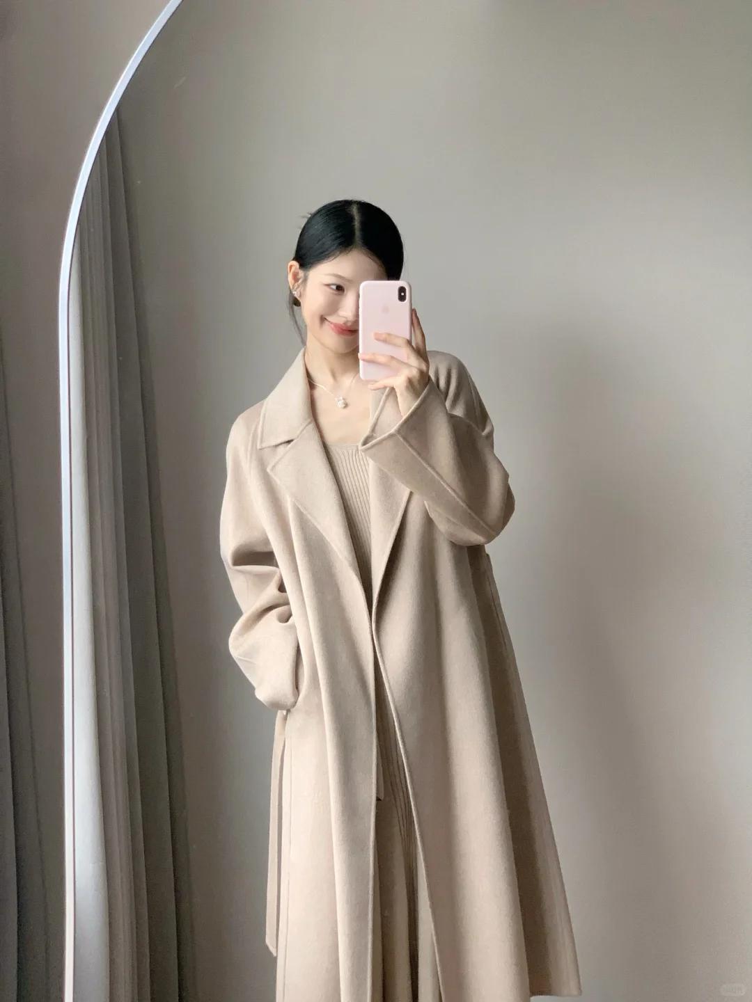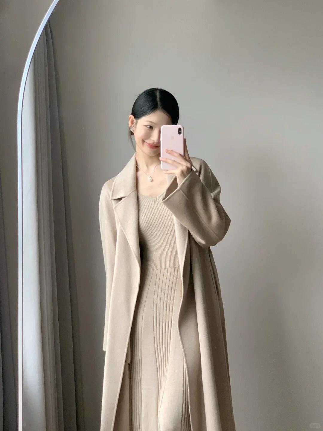 山羊绒大衣,冬季外套神级单品,想要的优雅高级它都有~ 卡其色山羊绒大衣内搭同色系针织连衣裙,大衣选择浴袍式带有腰带,扎起腰带真的超显身材,还特别高级,这种大衣的穿法有很多,不同的搭配也能呈现不同的效果。 首先大衣版型比较宽松舒适,遮肉效果堪称一绝,内搭可以选择修身款打底衫,也可以叠穿帽衫,下半身推荐搭配小脚裤,短裤短裙也能打造大长腿穿搭。 想要更温柔更有高级感,阔腿裤和半身裙也是不错的选择,推荐选择浅色系,或者黑色内搭+下装。图片来源于博主:Sallysally