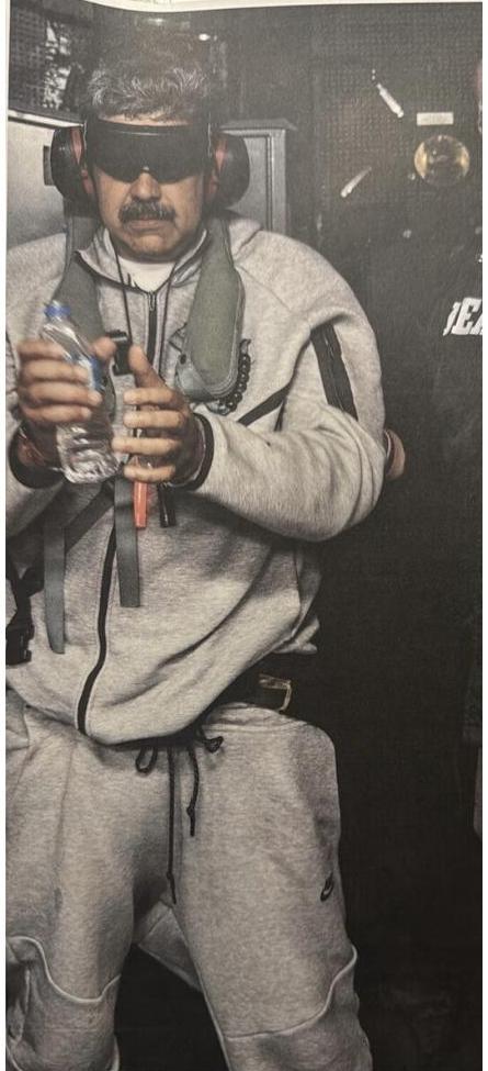 从委内瑞拉总统马杜罗这幅照片看,他被美国特种部队带离住所时很仓促,马杜罗也很狼狈,连裤子都是没有腰带的休闲服。不过,手里似乎是还拿着矿泉水瓶子,看来还没有受到严重的虐待,尽管如此,一个国家总统失去了自由还是很悲惨的。