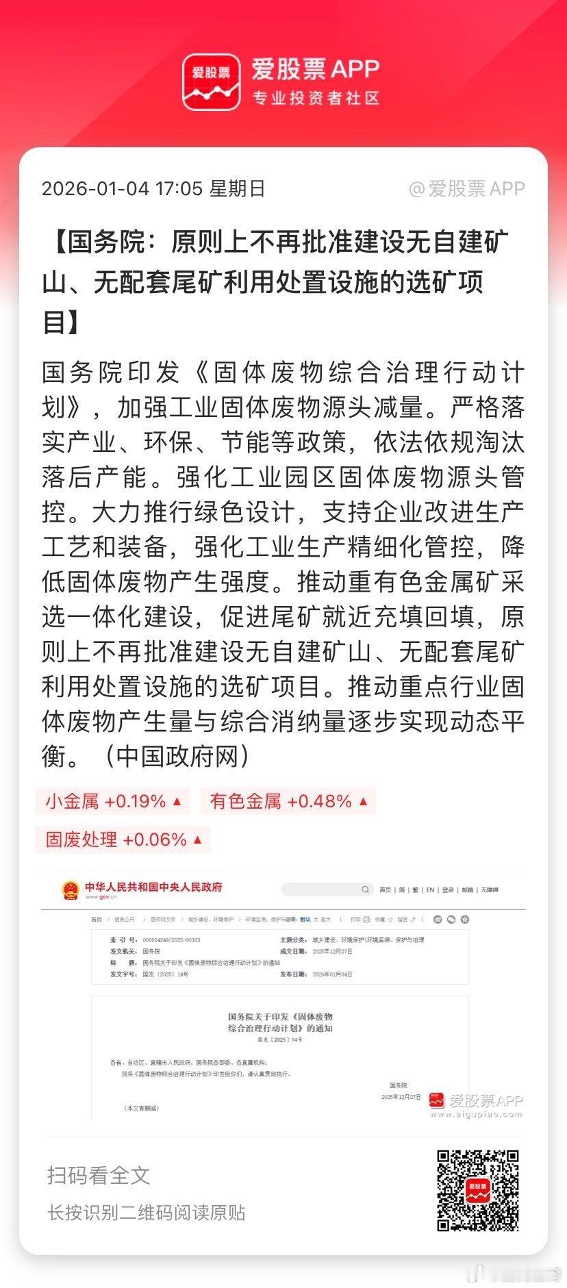 【国务院:原则上不再批准建设无自建矿山、无配套尾矿利用处置设施的选矿项目】国务院印发《固体废物综合治理行动计划》,加强工业固体废物源头减量。严格落实产业、环保、节能等政策,依法依规淘汰落后产能。强化工业园区固体废物源头管控。大力推行绿色设计,支持企业改进生产工艺和装备,强化工业生产精细化管控,降低固体废物产生强度。推动重有色金属矿采选一体化建设,促进尾矿就近充填回填,原则... 网页链接