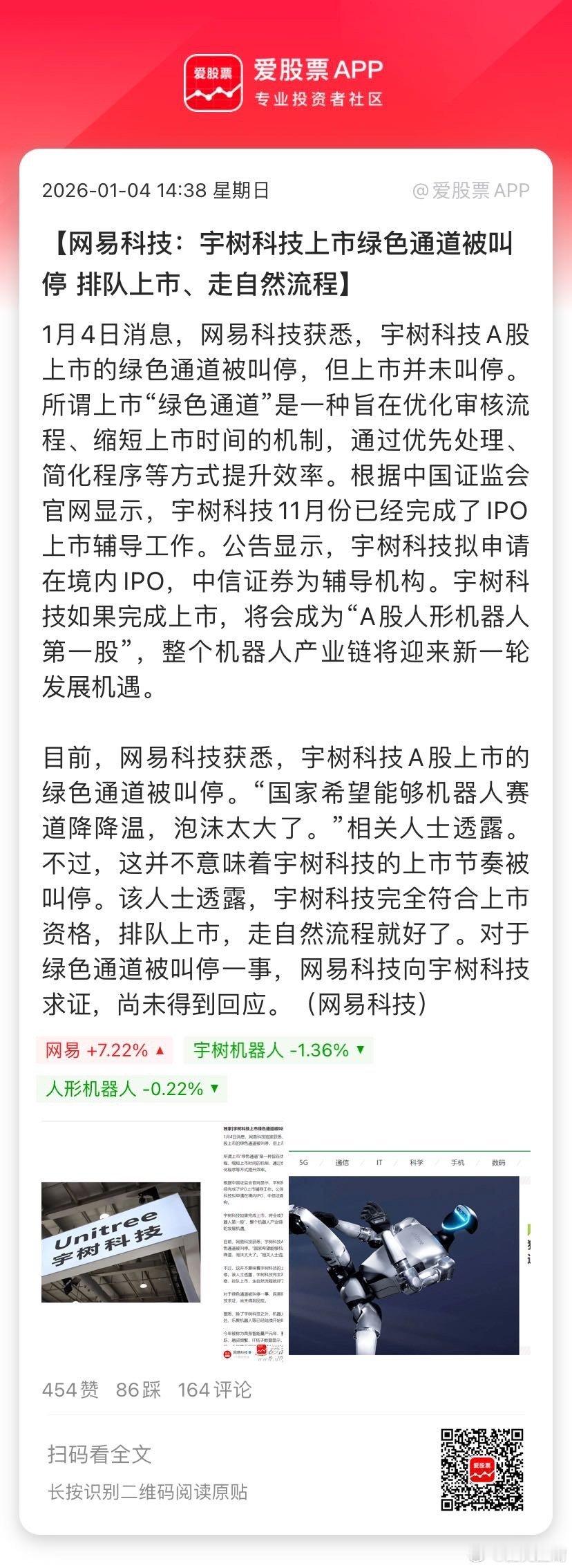 【网易科技:宇树科技上市绿色通道被叫停 排队上市、走自然流程】1月4日消息,网易科技获悉,宇树科技A股上市的绿色通道被叫停,但上市并未叫停。所谓上市“绿色通道”是一种旨在优化审核流程、缩短上市时间的机制,通过优先处理、简化程序等方式提升效率。根据中国证监会官网显示,宇树科技11月份已经完成了IPO上市辅导工作。公告显示,宇树科技拟申请在境内IPO,中信证券为辅... 网页链接