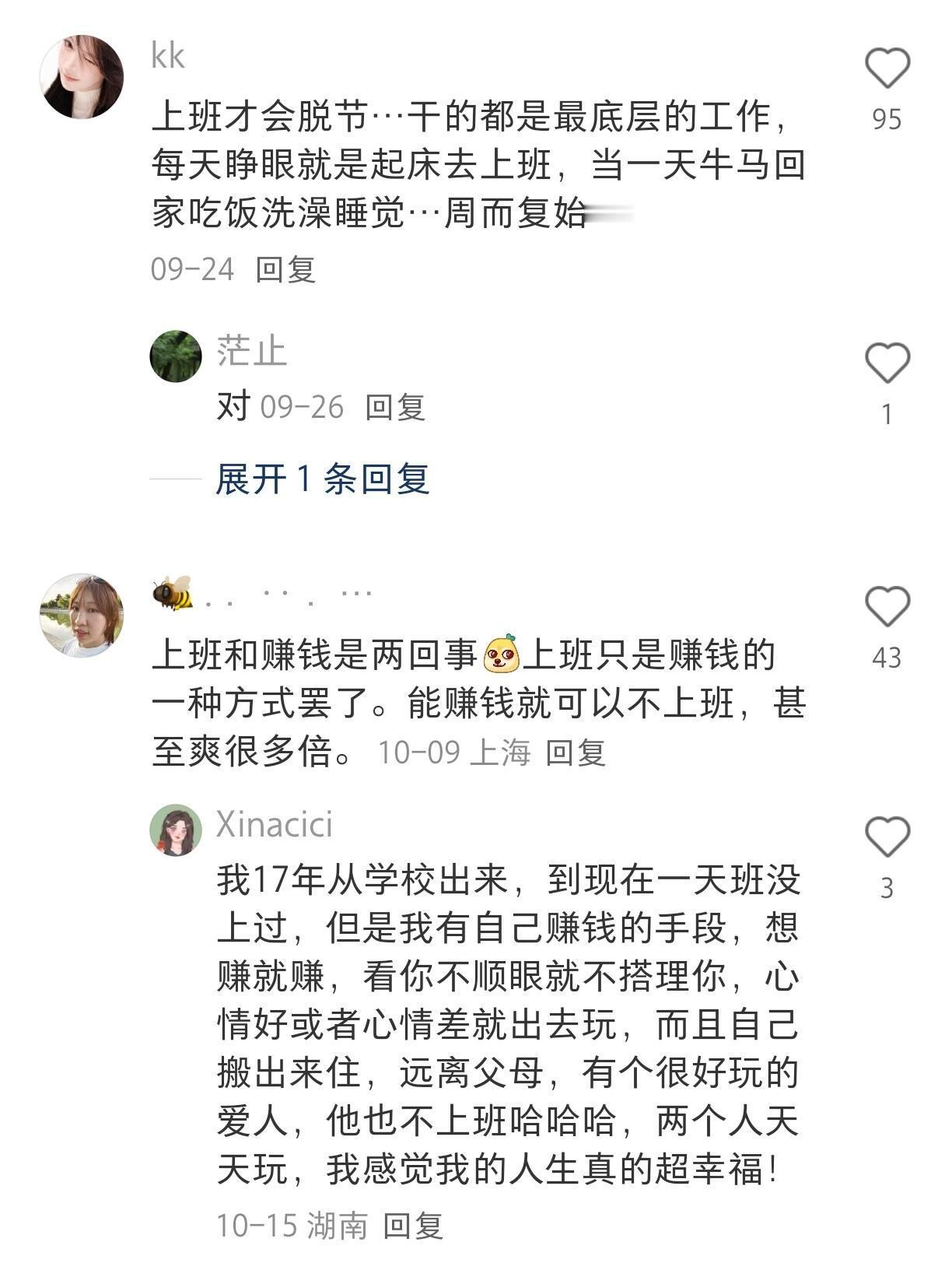如果一个人长期不工作看到评论很多人还是愿意不上班。但我觉得不上班好无聊啊,放假这几天没工作我都已经开始焦虑了。一心只想搞钱