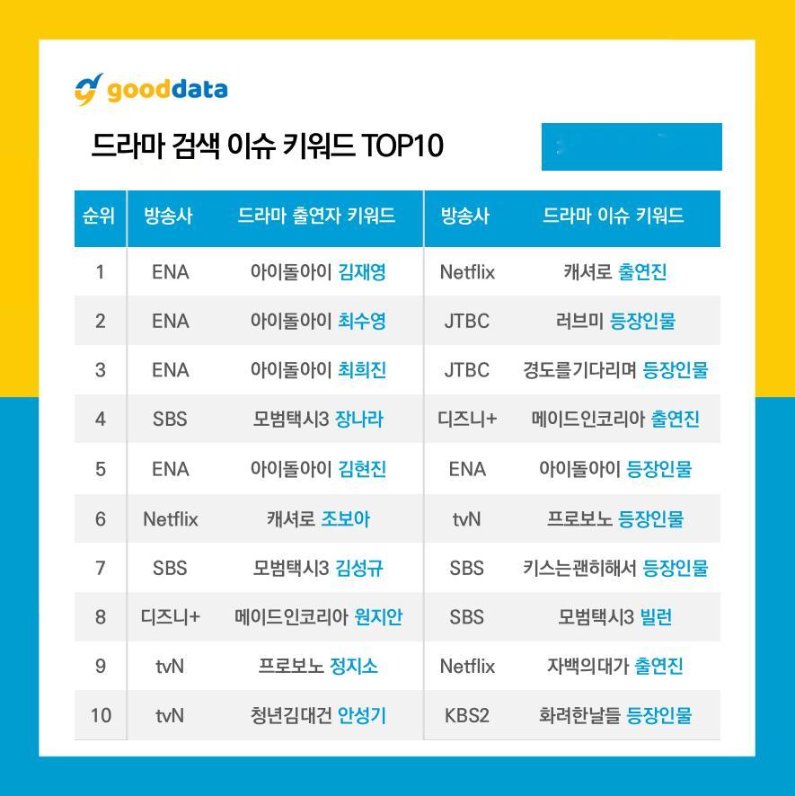 GOODDATA公布2025年12月第4周TV-OTT搜索榜TOP10、TV-OTT出演者搜索关键词TOP10、TV-OTT搜索关键词TOP10电视剧搜索榜TOP101.模范出租车3 2.一吻爆炸 3.韩国制造 4.等待京道 5.韩剧Love Me 6.现金英雄 7.韩剧公益律师 8.偶像疯子 9.华丽的日子 10.认罪之罪 电视剧出演者搜索关键词TOP101.《偶像疯子》金宰英 2.《偶像疯子》崔秀英 3.《偶像疯子》崔喜珍 4.《模范出租车3》张娜拉 5.《偶像疯子》金贤镇 6.《现金英雄》曹宝儿 7.《模范出租车3》金成圭 8.《韩国制造》元志安 9.《公益律师》郑知晓 10.《青年金大建》安圣基 电视剧搜索关键词TOP101.《现金英雄》出演阵容2.《Love Me》登场人物3.《等待京道》登场人物4.《韩国制造》出演阵容5.《偶像疯子》登场人物6.《公益律师》登场人物7.《一吻爆炸》登场人物8.《模范出租车3》反派9.《认罪之罪》出演阵容10.《华丽的日子》登场人物