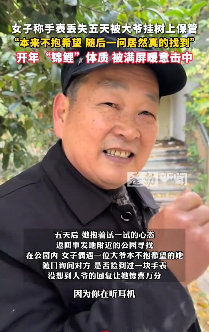 万万没有想到,1月1日,湖南长沙,一名女子在网上分享,五天前她在一个公园广场弄丢了一块价值40万的手表,五天后女子便抱着试一试的心态回到公园寻找这块手表。起初女子也没抱太大的希望,不料在公园遇到一位大爷,询问其是否捡到一块手表时,这大爷还真表示自己捡到一块手表,并将手表挂在树上等候失主来寻,而这块手表也正是女子丢失的那块! 女子说五天前,她在当地一个公园广场游玩时,不小心弄丢了自己的手表,这可不是普通的手表,市价足足有40万,弄丢之后她又急又悔,把能找的地方都翻了个遍,却连一点线索都没有。 在公共场所丢了这么贵重的东西,本就难找回,更何况一放就是五天,这五天里她无数次想起那块表,心里早就不抱什么希望了,毕竟公园人来人往,别说一块价值不菲的名表,就算是不起眼的小物件,放几天也未必还在原地。 到了1月1日新年的第一天,女子心里揣着一丝不甘心,还是决定再去那个公园看看,与其说是寻找,不如说是给自己一个交代,就抱着“来都来了碰碰运气,找不到就彻底死心”的想法,慢悠悠地走进了公园。 她沿着当初走过的路线一点点排查,目光扫过广场的角落、路边的座椅,每看一处,心里的期待就少一分,只觉得这趟大概率又是白跑。 公园里来往的人不算少,女子漫无目的地逛着,视线偶然落在一位坐在长椅上休息的大爷身上。大爷看起来慈眉善目,不像是不好说话的人,女子犹豫了一下,还是走了过去,抱着试试看的心态,问大爷有没有见过一块手表,问出口的瞬间,她就做好了被拒绝的准备,毕竟这么多天过去了,大爷就算见过,也未必记得。 可万万没想到大爷听到问题后,没有丝毫迟疑,只是平静地点了点头,说自己前几天确实捡到过一块手表,那语气平淡得就像在说“今天天气不错”,仿佛捡到的不是40万的名表,只是一件再普通不过的小物件,女子瞬间愣在了原地,惊喜来得太突然,让她一时之间竟不知道该说些什么,原本低落的心情一下子被点燃了。 没等女子缓过神,大爷已经站起身,朝着公园深处走去,示意女子跟着自己,女子连忙快步跟上,心里又好奇又忐忑,猜想着大爷会把表放在哪里,是带回家保管了还是交给了公园管理处,可接下来的场景,完全超出了她的预料。 大爷带着她走到一棵景观树前,停下脚步抬手指了指树干上的一根树枝,女子顺着大爷指的方向看去,眼睛一下子就亮了,自己丢失了五天的那块名表,正稳稳地挂在树枝上,就那样暴露在空气中,经历了五天的风吹日晒,却完好无损地等着主人,女子走上前,小心翼翼地取下手表,确认无误后,心里的激动难以形容。 后来女子才知道,大爷捡到手表后,既没有想过占为己有,也没特意找地方藏起来,他不知道失主是谁也没法联系到人,索性就把手表挂在了捡到地方附近的树上,想着失主发现丢了之后,说不定会回来找,这样就能一眼看到,在大爷朴素的认知里,捡到别人的东西,就该还给人家,挂在树上既显眼,又能守住这份财物,等着失主上门。 握着失而复得的手表,女子看着眼前的大爷,满心都是感激,她怎么也没想到,自己抱着试一试的心态回来寻找,竟然真的能找回手表,更没想到会遇到这样一位善良淳朴的老人,这份意外的惊喜,成了她2026年新年伊始最珍贵的礼物。 网友们看到这个故事后,也都被大爷的举动打动了,纷纷称赞大爷是“最美拾金不昧者”,不过也有网友理性提醒,虽然大爷的心意可贵,但把贵重物品挂在树上确实有风险,万一被别有用心的人拿走,后果就不好了,捡到贵重物品后交给警察,才是最稳妥的方式。 但不可否认的是,大爷这份毫无杂质的善意,就像长沙冬日里的一缕暖阳,温暖了很多人,在这个凡事都习惯权衡利弊的时代,大爷用最简单直接的方式,诠释了人性的美好,也让这个新年的开端,多了一份温柔与感动。