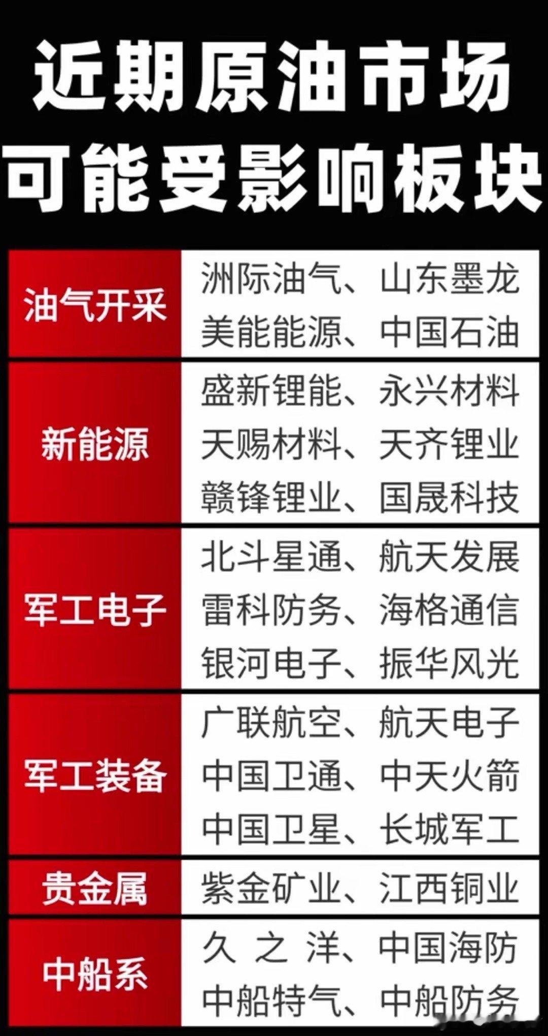 原油市场波动引发连锁反应?六大板块谁能扛住风浪觅新机?原油市场的每一次波动,都如同投入经济池中的石子,激起各产业链的连锁反应。近期原油市场的变化,让油气开采、新能源、军工电子等六大板块站在了市场的聚光灯下。在油价涨跌的博弈中,这些板块究竟是会被市场波动裹挟,还是能从中找到新的发展机遇?不同板块的布局企业,又该如何在变局中站稳脚跟?油气开采板块作为原油市场的直接关联者,首当其冲迎来市场考验。洲际油气、山东墨龙聚焦油气勘探开发,美能能源深耕油气分销,中国石油更是国内油气领域的龙头企业,油价的波动直接影响其业绩表现——油价上涨时,企业盈利空间扩大;油价下跌则面临营收承压,这类企业的发展高度绑定原油市场的走势。新能源板块则在原油波动中迎来替代机遇。盛新锂能、天齐锂业、赣锋锂业等锂资源企业,天赐材料布局电解液领域,国晟科技深耕光伏赛道,原油作为传统能源的代表,其价格波动会倒逼新能源产业加速替代,油价走高时,新能源的市场需求与投资热度往往会同步提升,这类企业也因此迎来发展红利。军工相关板块在原油波动中展现出较强的抗波动性。军工电子领域的北斗星通、雷科防务,军工装备领域的航天电子、中国卫星,中船系的中国海防、中船防务等企业,其业务需求多源于国防建设的刚性规划,受原油市场短期波动影响较小,反而可能因地缘政治等引发原油波动的因素,迎来军工订单的增量机会。贵金属板块则成为市场的“避风港”。紫金矿业、江西铜业等企业布局黄金、铜等贵金属开采与加工,原油市场波动往往伴随市场避险情绪升温,贵金属的保值属性会被凸显,企业也因此获得估值修复的机会。从直接关联的油气开采,到替代效应的新能源,再到抗波动的军工与避险的贵金属,原油市场波动下的六大板块呈现出差异化的发展逻辑。对于市场而言,这种波动既是挑战也是契机,而那些找准自身定位、深耕核心业务的企业,终将在原油市场的风云变幻中找到属于自己的发展节奏。