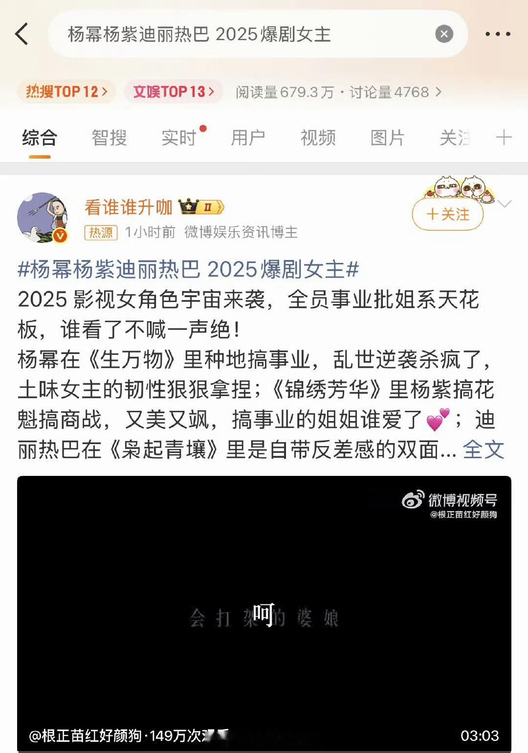 多人热搜这么多,是有什么kpi要完成吗?看起来很明显有人新剧要上,又是这熟悉的操作,谁也别想逃 杨幂邢菲赵丽颖兰西雅 是姐妹是知己,迪丽热巴辛芷蕾卢昱晓 2025打女,杨幂杨紫迪丽热巴 2025爆剧女主,李沁宋茜周也 2025女将军