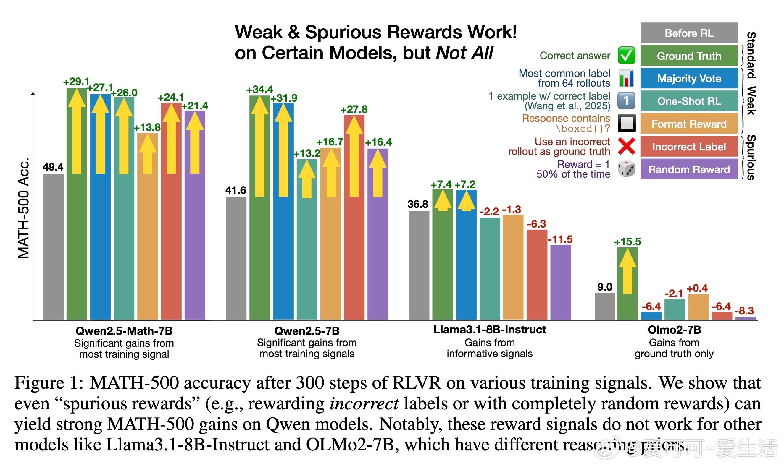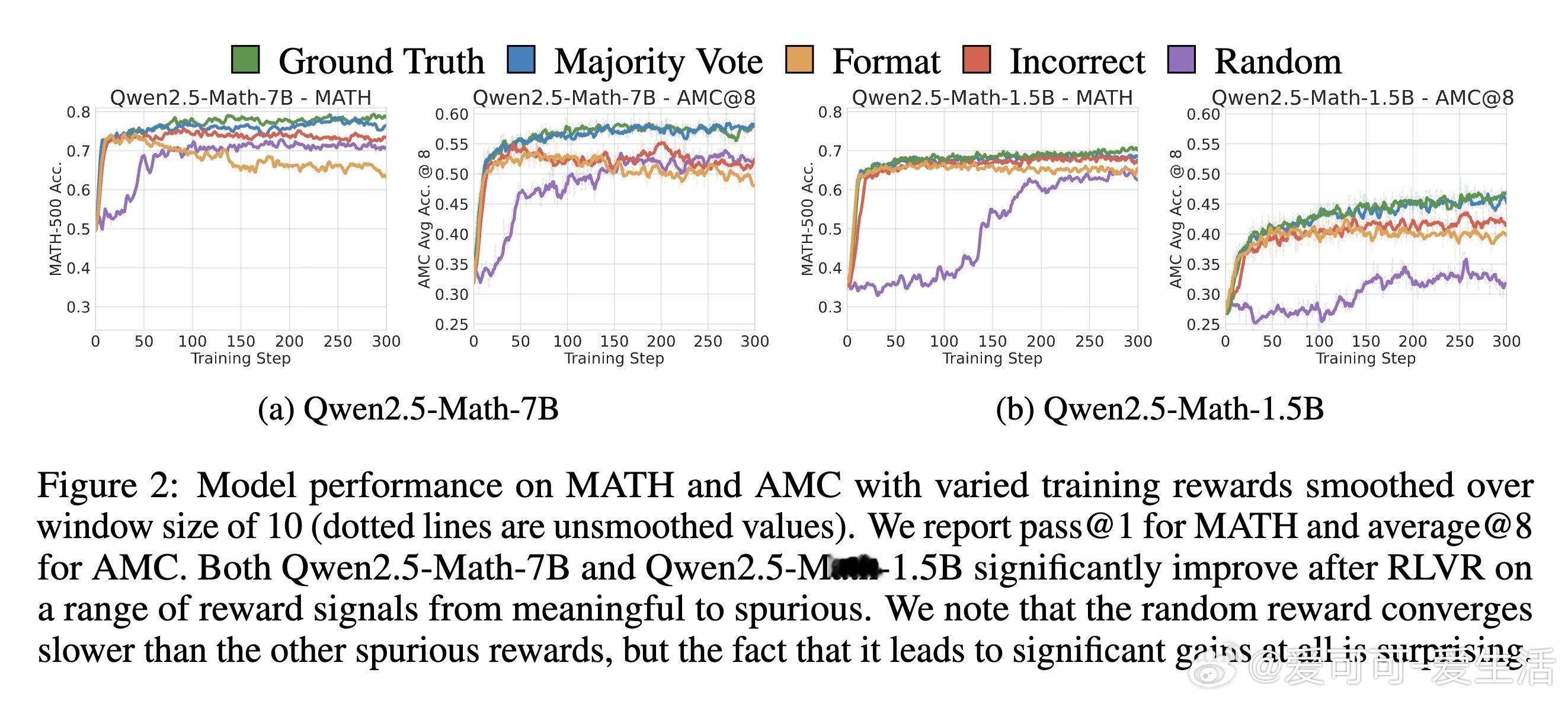 [LG]《Spurious Rewards: Rethinking Training Signals in RLVR》R Shao, S S Li, R Xin, S Geng... [University of Washington] (2025) 强化学习在数学推理领域的成功,或许并非完全源于精准的奖励反馈,而是一场关于唤醒潜能的奇妙实验。最近一项关于RLVR(可验证奖励强化学习)的研究揭示了一个反直觉的现象:即便给模型提供完全随机、仅看格式、甚至完全错误的奖励信号,Qwen2.5-Math等模型依然能在数学竞赛题目上取得惊人的进步。以下是这项研究带给我们的深度思考与技术启发:1. 奖励信号的幻觉在传统的认知中,强化学习依赖于准确的对错反馈。然而实验显示,Qwen2.5-Math-7B在接受随机奖励时,其MATH-500的准确率提升了21.4%;在接受错误标签奖励时,提升了24.1%。这几乎逼近了使用正确标签训练带来的29.1%的涨幅。这意味着,对于某些模型而言,奖励信号有时只是一个启动开关,而非导航地图。2. 预训练决定的天花板这种乱发奖也能提分的奇迹并非普适。研究发现,同样的随机奖励在Llama3.1或OLMo2上几乎毫无作用,甚至会导致性能下降。这说明RLVR的效果高度依赖于模型在预训练阶段积累的知识底蕴。如果模型本身没有埋下推理的种子,再多的强化也开不出花。3. 隐藏的利器:代码思维为什么Qwen系列表现如此特殊。研究者发现,Qwen在预训练中习得了一种独特的代码思维。即便没有代码执行环境,它也会在推理过程中自动生成Python代码辅助思考。RL训练的过程,本质上是把这种高效的推理表征从模型的深处打捞出来。当代码思维的频率从65%提升到90%以上时,模型的逻辑能力也随之跃迁。4. 强化学习的本质是筛选而非创造这项研究提出了一个深刻的假设:当前的RLVR技术可能并没有教会模型新的推理能力,而是在庞大的概率空间中,通过某种机制(如GRPO的裁剪偏差)将模型预训练中已经学会的高质量路径筛选并固化了下来。5. 对研究者的警示目前开源社区过度依赖Qwen模型进行RLVR研究。但由于Qwen对噪声奖励具有极强的鲁棒性,很多看似有效的创新算法,可能只是吃到了模型底座的红利。未来的研究必须在更多样化的模型家族上进行验证,才能区分什么是算法的功劳,什么是底座的恩赐。启示:- 奖励信号有时只是噪音,真正的力量早已埋藏在预训练的深处。- 强化学习不是在荒地上盖楼,而是在森林里开路。- 优秀的模型底座,本身就具备自我修正的逻辑惯性。论文链接:arxiv.org/abs/2506.10947