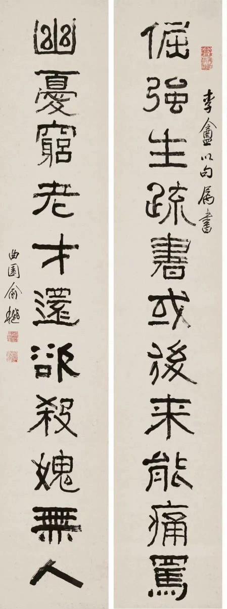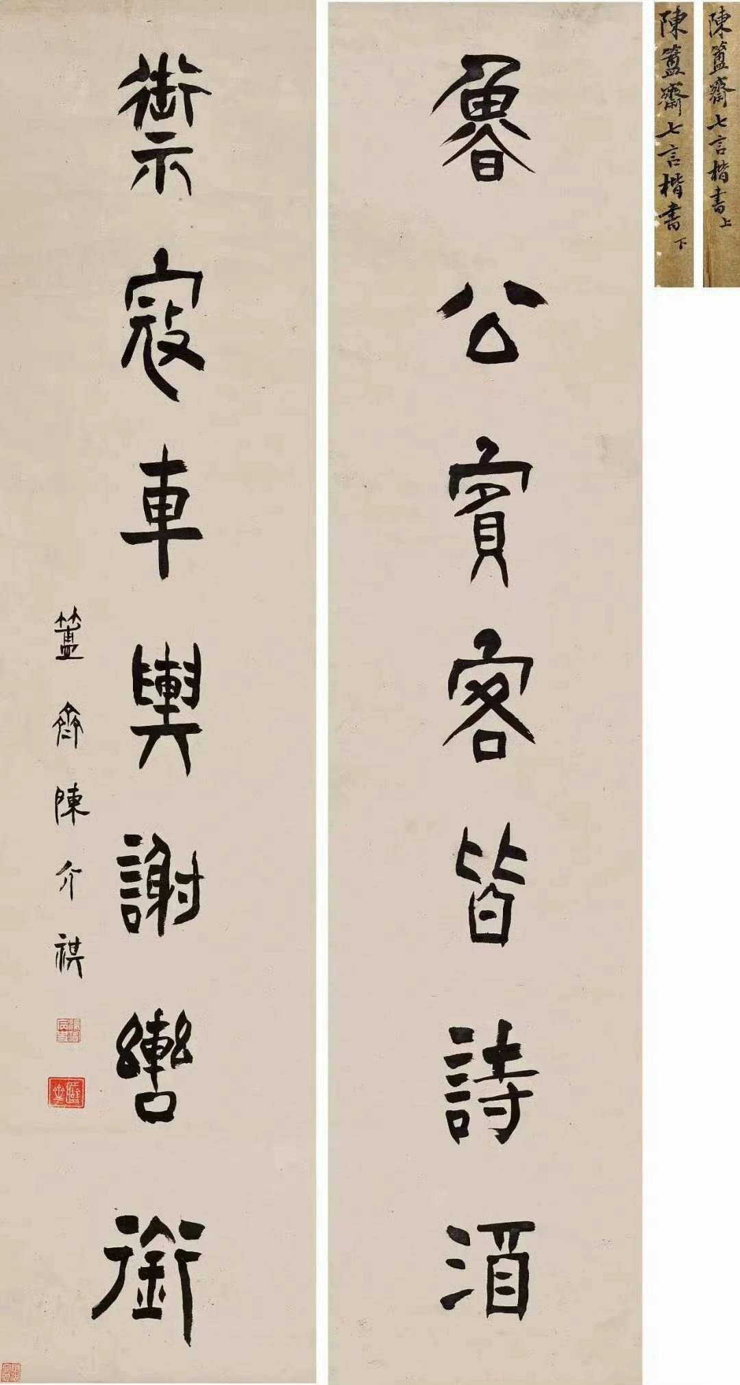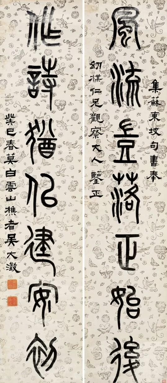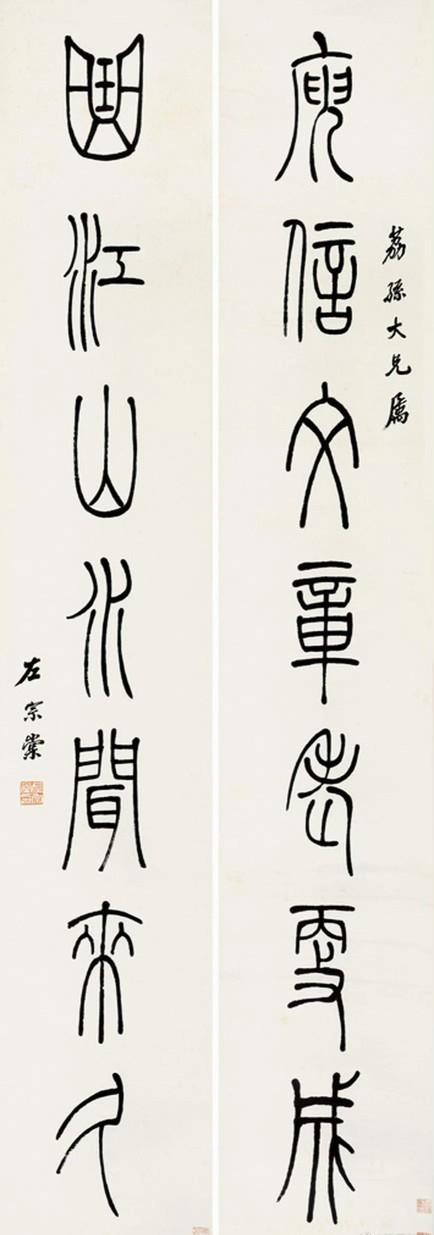 清 赵之谦 篆书对联 《高人自与山有素,老可能为竹写真。》 清 吴大澂 篆书对联 《风流岂落正始后,作诗犹似建安初。》 清 俞樾 篆书对联 《及时为乐请自今始;于世无争长如古初》 黄宾虹 篆书对联 何绍基 篆书对联 《凫雁参差流音将夕,藤萝香蔼疏阴送秋》 清 陈介祺 篆书对联 《鲁公宾客皆诗酒;御寇车舆谢辔衔。》 杨沂孙 篆书对联 《贾谊是书生,一榻偶依陈太守;杜侯实才子,高吟不减谢宣城。》 左宗棠 篆书对联 《庾信文章老更成,曲江山水闻来久。》 俞樾 隶书对联 《倔强生疏书或后来能痛骂;幽忧穷老才还欲杀媿无人。》