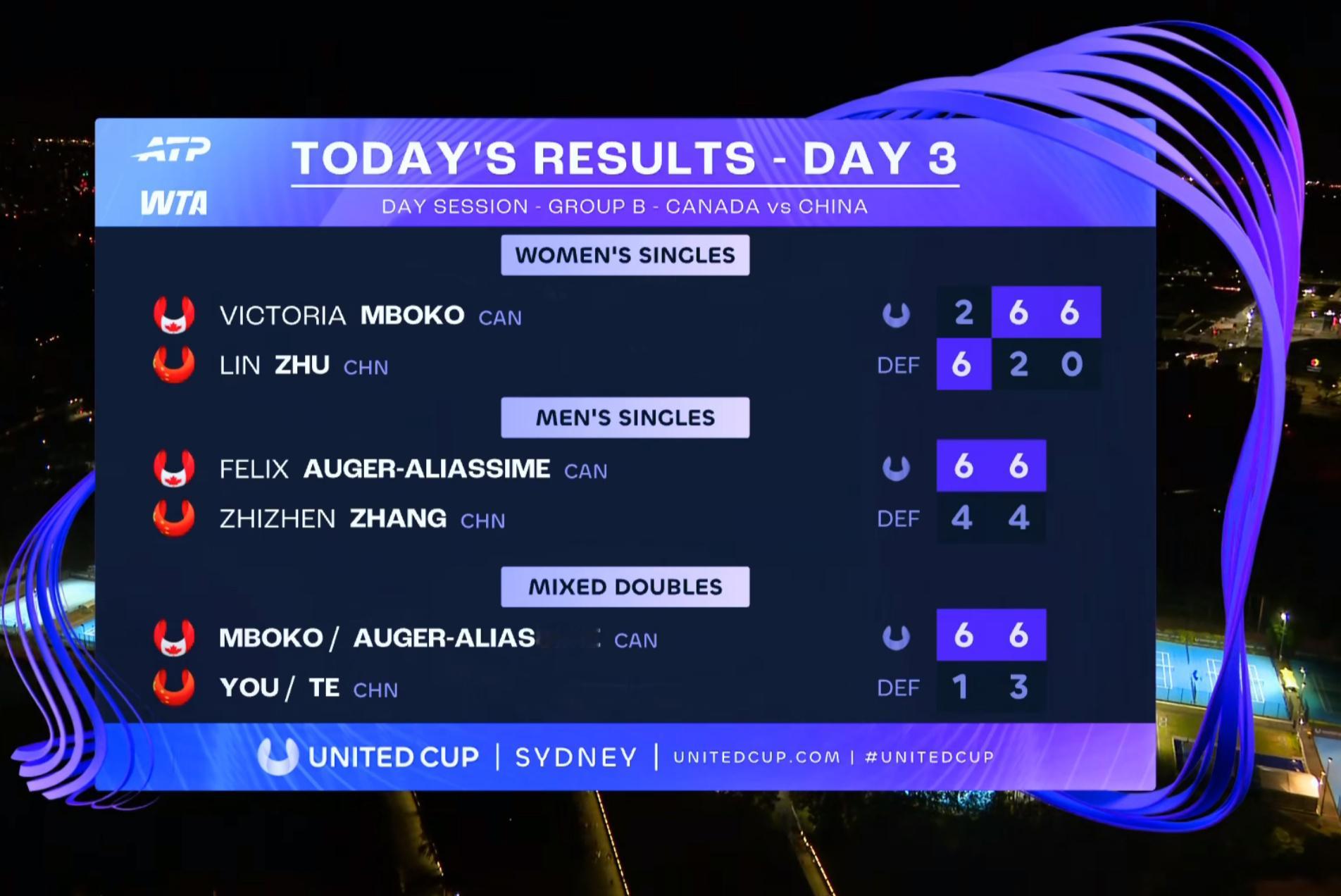 联合杯小组赛第二场,中国队最终 0-3 不敌加拿大,1 胜 1 负,出线形势严峻特日格乐/尤晓迪 1-6/3-6 阿利亚西姆/姆博科张之臻4-6/4-6阿利亚西姆朱琳6-2/2-6/0-6 姆博科联合杯联合杯中国vs加拿大