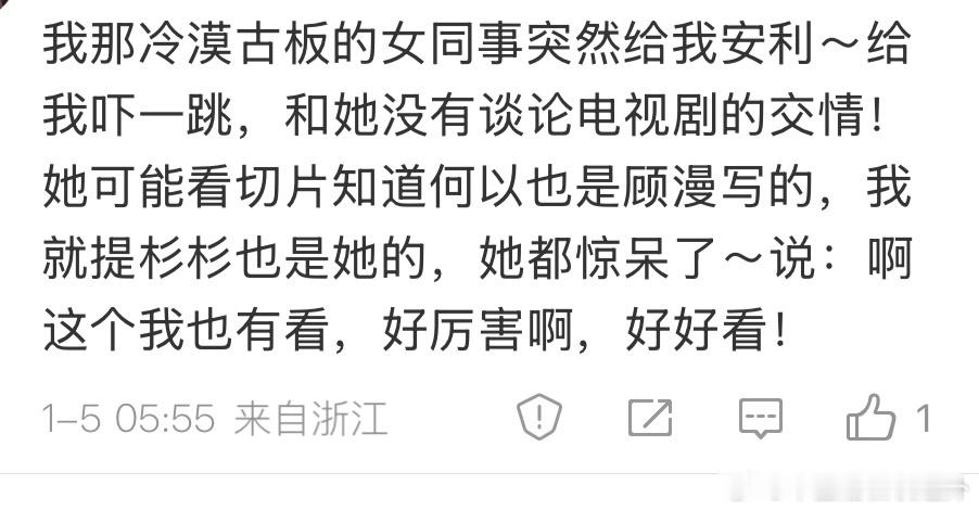评论区带给人很多意想不到的欢乐。【这么好的剧,宿舍楼上都是讨论的,食堂也有人边吃边讨论的……】【我那冷漠古板的女同事突然给我安利,给我吓一跳,和她没有讨论电视剧的交情!她都惊呆了,好厉害啊,好好看啊!】一些文案属实太用力了点,可能也为了适配《骄阳似我》的偶像剧感吧。为了这个剧,评论区献祭了80后、90后和我那冷漠古板的女同事。骄阳似我26集37分
