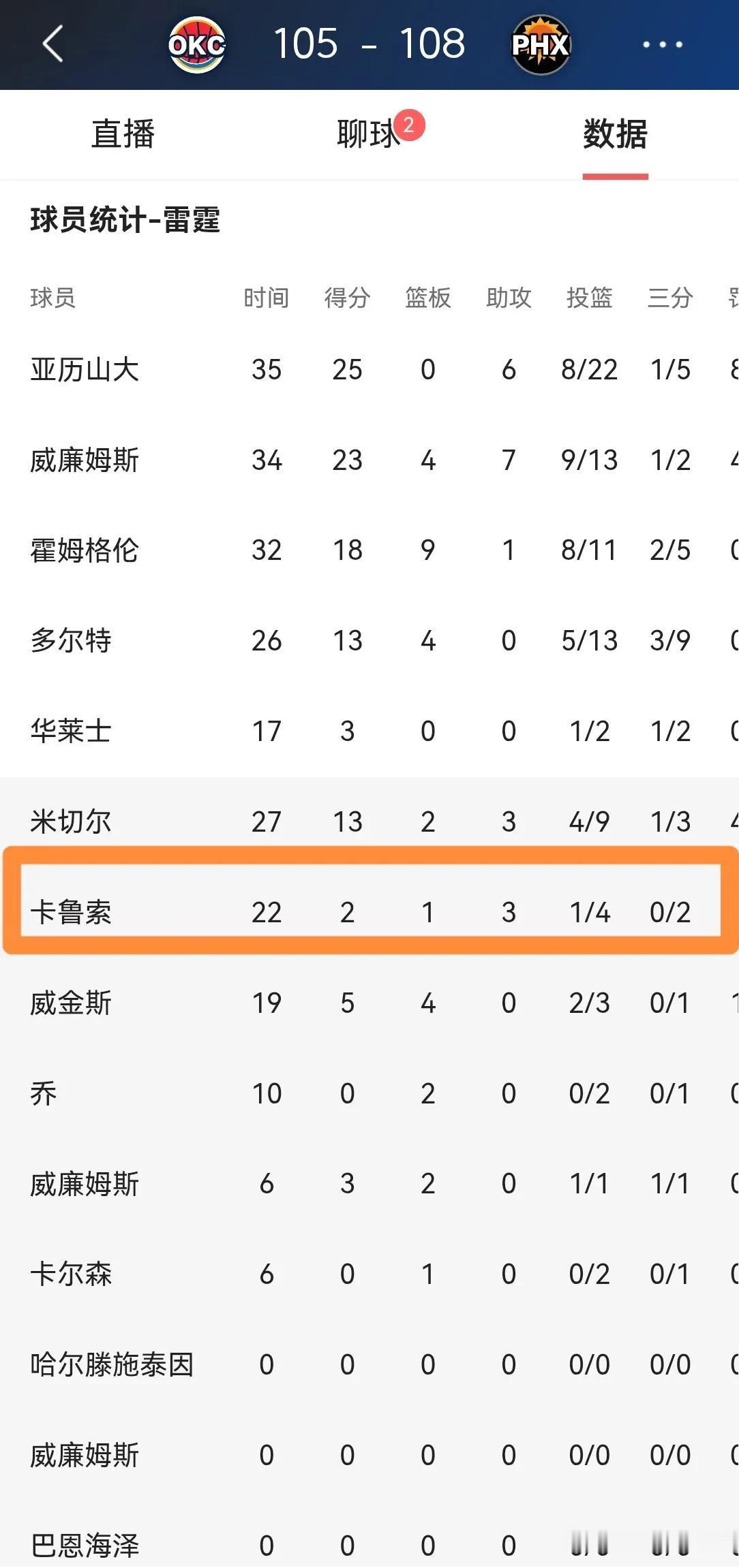 我对雷霆大将卡鲁索真是忍无可忍了!在今天雷霆以105:108爆冷不敌太阳的比赛中,卡鲁索的表现真是一言难尽。 全场比赛下来,卡鲁索替补出战22分钟,投篮4中1,其中三分球2中0仅仅得到可怜的2分,他的场上正负值为-10。 值得一提的是,这已经是卡鲁索本赛季多次打出糟糕的表现了,我对他真是到了忍无可忍的地步了。