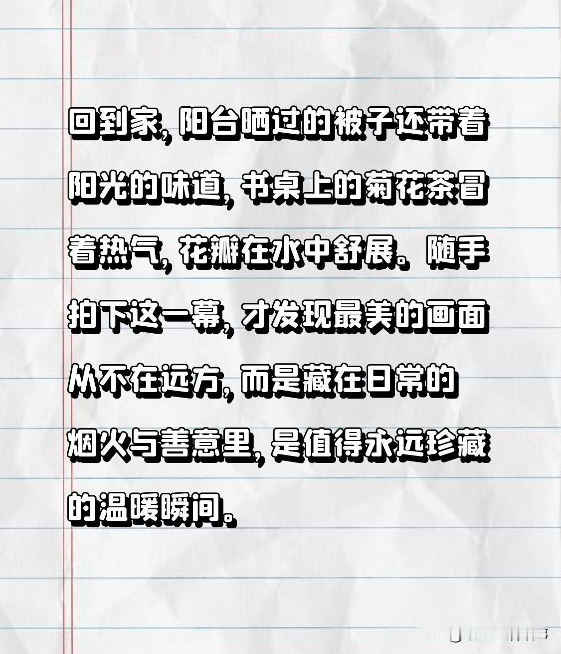 清晨被窗帘缝漏进的阳光唤醒,揉着眼睛摸起手机,对准窗台上的多肉按下快门。晨光为肥厚的叶片镀上金边,叶尖的露珠折射出细碎光芒,像捧着一把星星,开启了满是光亮的一天。 通勤路上绕进巷口的早餐摊,蒸汽氤氲中,老板正麻利地翻着煎饼。金黄的饼皮在铁板上滋滋作响,葱花与芝麻的香气扑面而来。我举起手机,定格下老板递来热煎饼时的笑脸,玻璃上凝结的雾气让画面添了几分朦胧的暖意。 午后在公园散步,老槐树的枝叶织成浓密的绿荫,阳光穿过缝隙洒下斑驳光影,落在长椅上、石板路上,像撒了把碎金。不远处,小朋友追着泡泡奔跑,彩色的泡泡在光里旋转飞舞;两位老人坐在长椅上晒太阳,手牵手轻声聊着天,影子被拉得很长。我悄悄按下快门,把这份闲适与温情藏进镜头。 傍晚下班时,晚霞把天空染成温柔的橘粉色。路边卖橘子的老奶奶正往袋子里给顾客多塞一个果子,笑着说“尝尝鲜”。拎着沉甸甸的橘子往家走,晚风里都是清甜气息,回头拍下老奶奶守着竹筐的身影,筐里的橘子在霞光下黄澄澄的,格外诱人。 回到家,阳台晒过的被子还带着阳光的味道,书桌上的菊花茶冒着热气,花瓣在水中舒展。随手拍下这一幕,才发现最美的画面从不在远方,而是藏在日常的烟火与善意里,是值得永远珍藏的温暖瞬间。