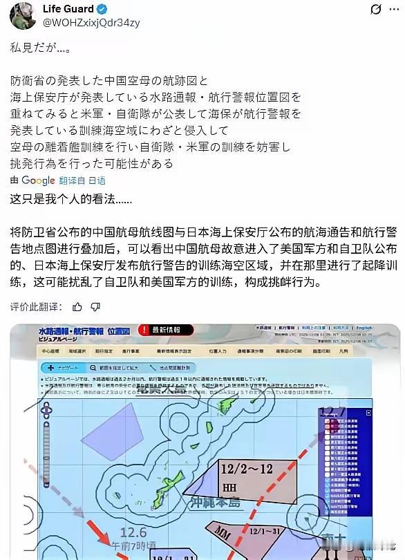 寇能往,我亦能往。日本周边的公海,又不是你日美的自留地、后花园。 中国辽宁舰航母编队大摇大摆挺进日美演习区域。既然是公海,为啥你可以在这里演习,我就不能在这里训练呢? 最近,日本网友绘制出中国辽宁号航母编队,自由进出日美演习航行警告区、并且进行高强度战机起降训练的地图跟照片,同时抗议中方雷达照射日本军机,一副小媳妇受不了的扭捏姿态。 侵入对方演习区域,进行抵近侦查,不是日美最擅长搞的事情嘛,这回中国才牛刀小试,日本就受不了啦、跳出来抗议,这唱的是哪门子戏嘛。 这只能说明中方这方面的工作做得还不够,再加强一下,频率再高一点,再近一点。日本习惯了就好了。就像当年我们划防空识别区一样,一开始日美也是跺脚抗议,后来不还是得乖乖遵守。