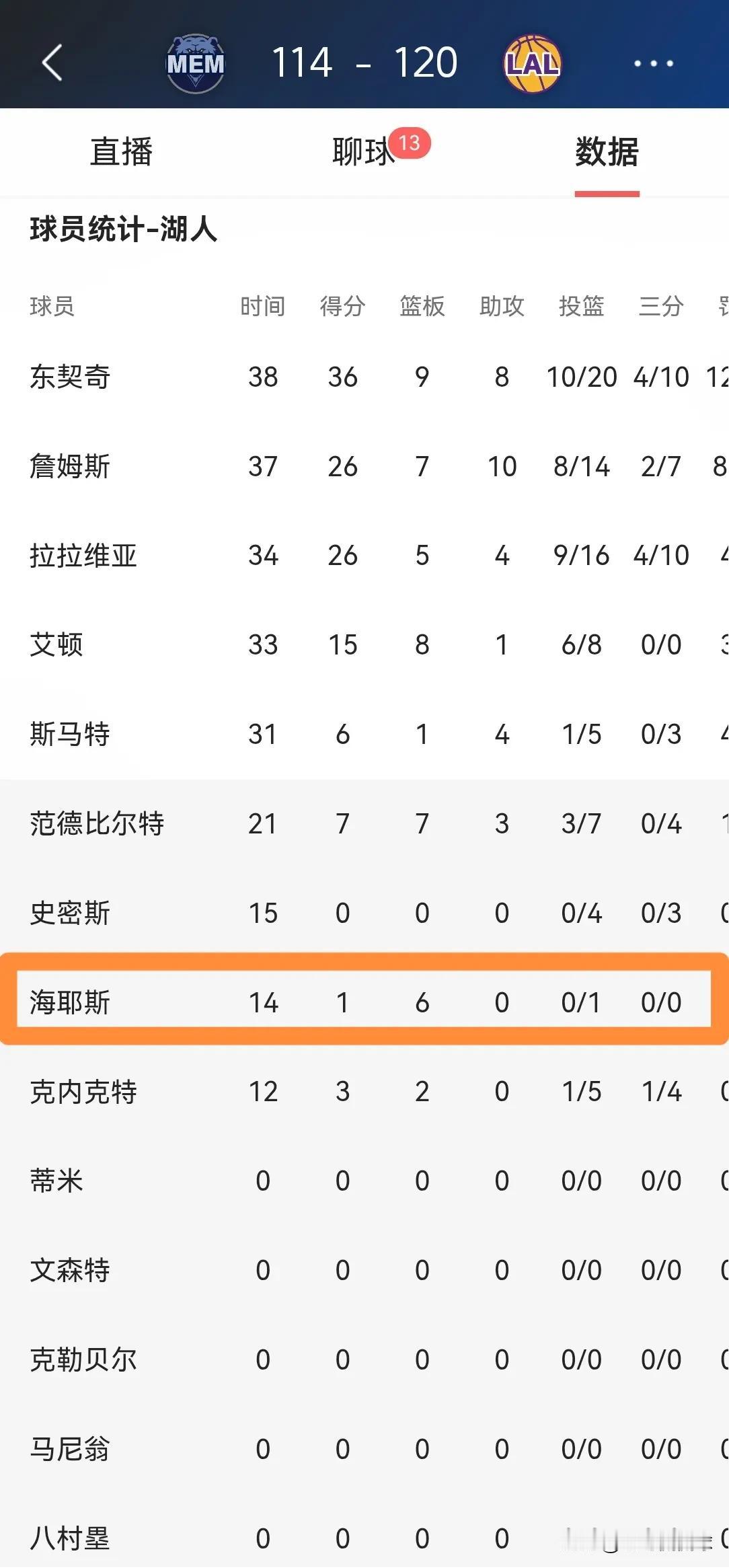 湖人年轻中锋海斯真是毫无存在感!在今天湖人主场以120:114击败灰熊的比赛中,海斯仅仅得到了1次出手机会,他在进攻端真是毫无存在感。 全场比赛下来,海斯替补出战14分钟,投篮1中0,其中罚球2中1仅仅得到1分,不过有6篮板。 毫不夸张的说,如果海斯想要在今夏休赛期签下一份大合同,他必须在进攻端有所表现,他不能只会傻了吧唧的抢篮板。