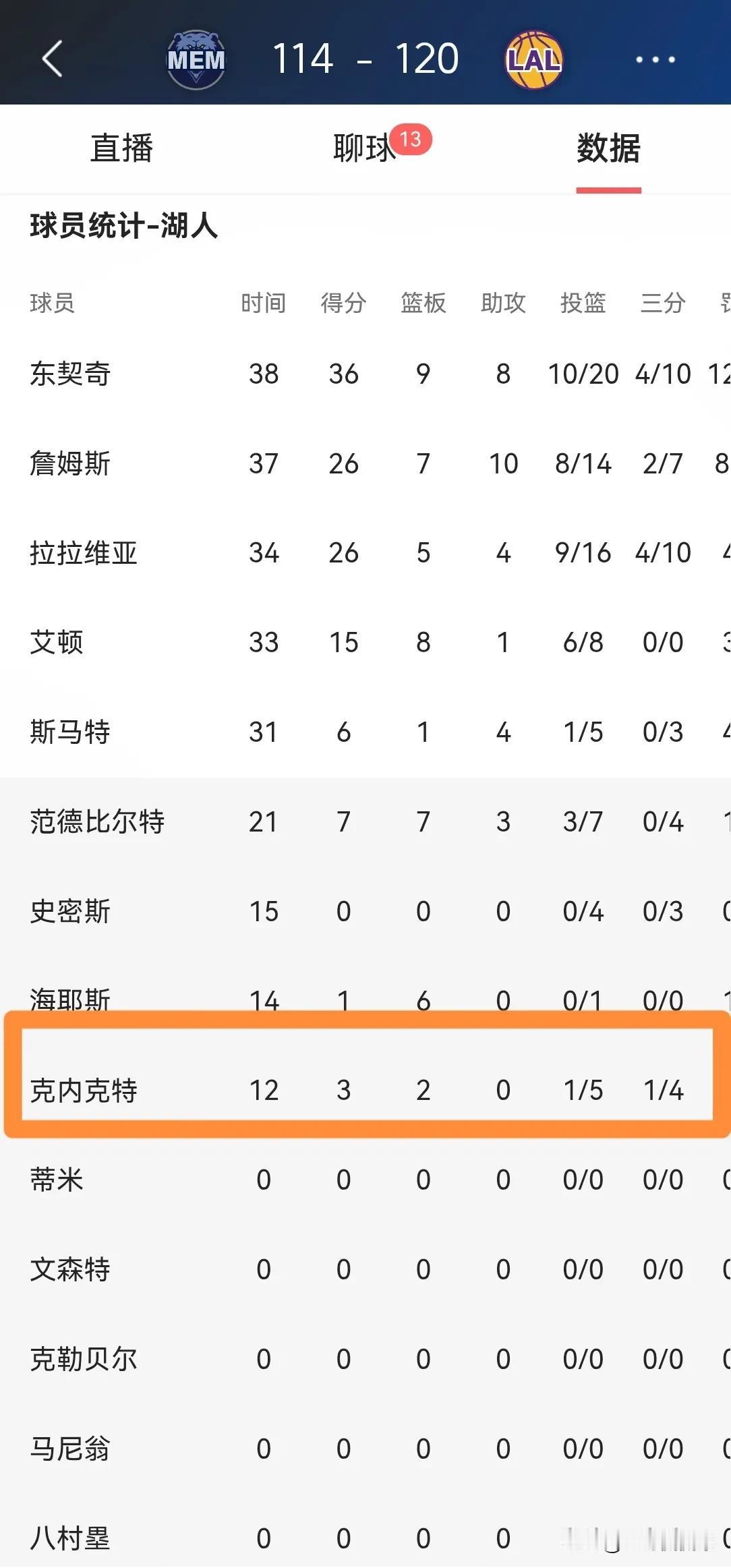 湖人小将克内克特真是烂泥扶不上墙!在今天湖人主场以120:114击败灰熊的比赛中,克内克特获得了多达12分钟的上场时间却表现的一塌糊涂。 整场比赛下来,克内克特替补出战12分钟,投篮5中1,其中三分球4中1非常低效的得到3分,还有2次失误。 众所周知,本场比赛雷迪克教练之所以给克内克特一些上场时间,就是希望克内克特可以命中空位三分,结果克内克特彻底的让雷迪克教练失望了。