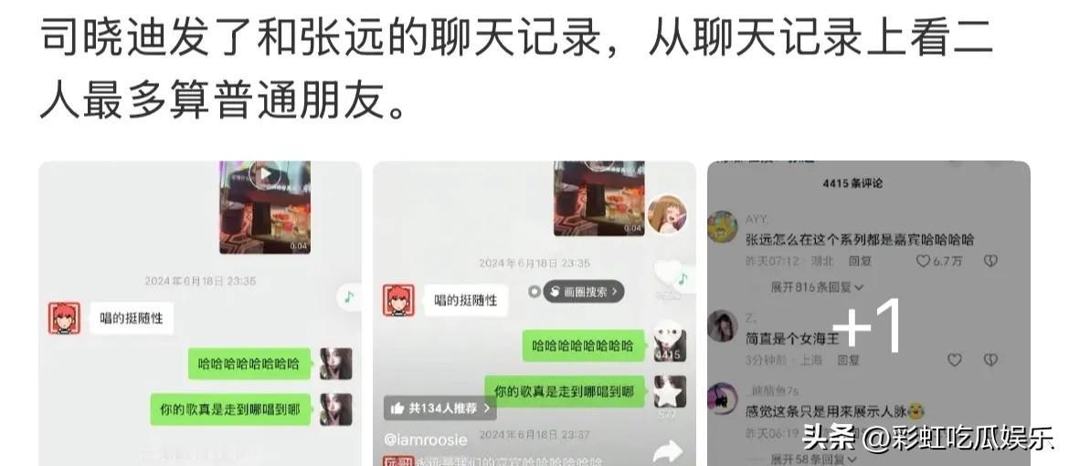 1月5日,司晓迪晒了与张远的聊天记录,没有暧昧的东西,只是普通朋友。 看来张远为人正直经得起诱惑,张远的音乐深情专一,不是那种爱玩的人,眼神清澈才不会与他们同流合污。 我就纳闷了,司晓迪到底是谁,为什么能认识那么多艺人,还有那么多顶流艺人和她恋爱,看来娱乐圈就是一个圈,明星网红是一家。