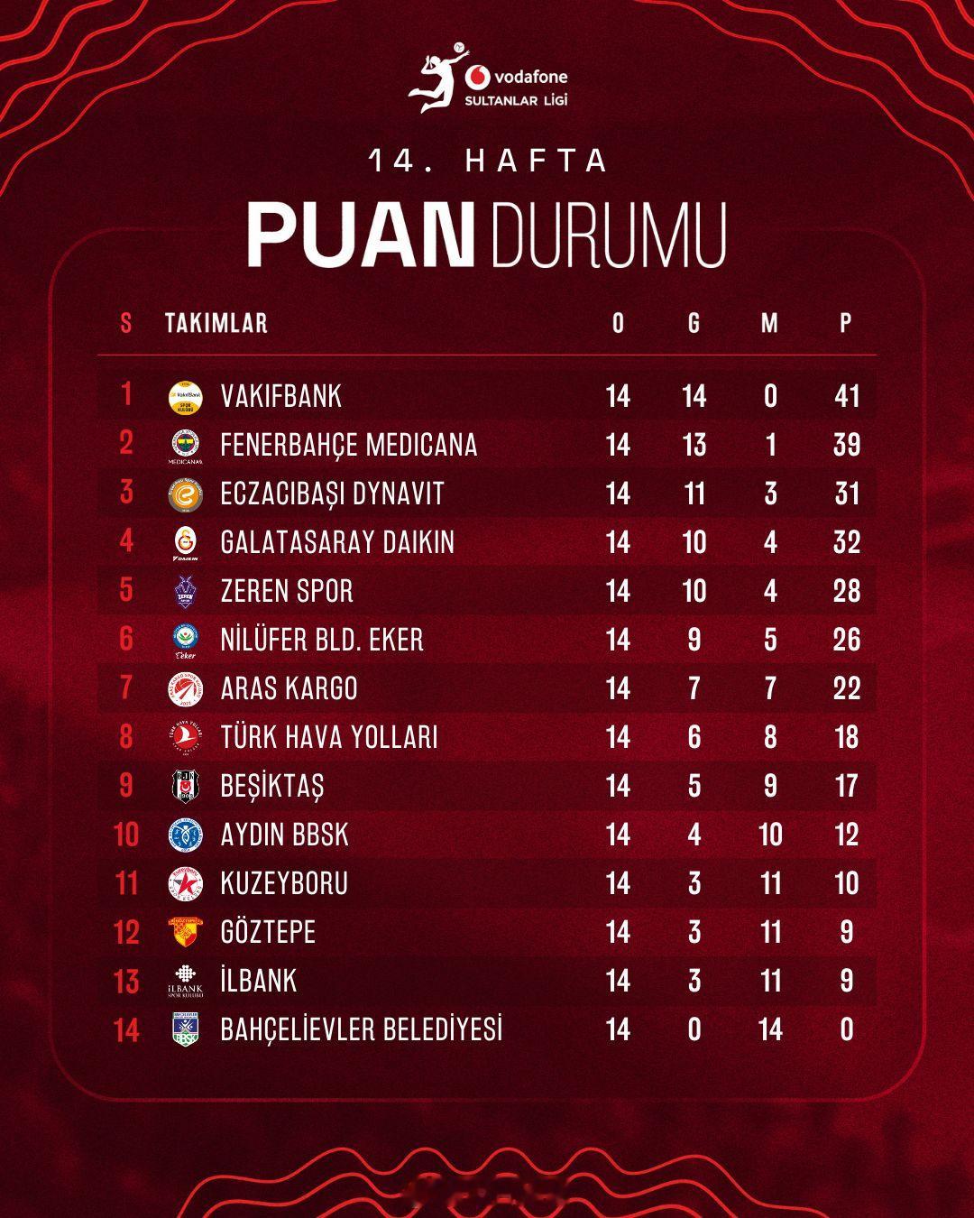 2025-2026女排土超 常规赛第14轮比赛结果,和此轮过后的积分排名。加拉塔萨雷排名第四,比排名第三的伊萨奇巴希少1场胜场,但多1分积分。
