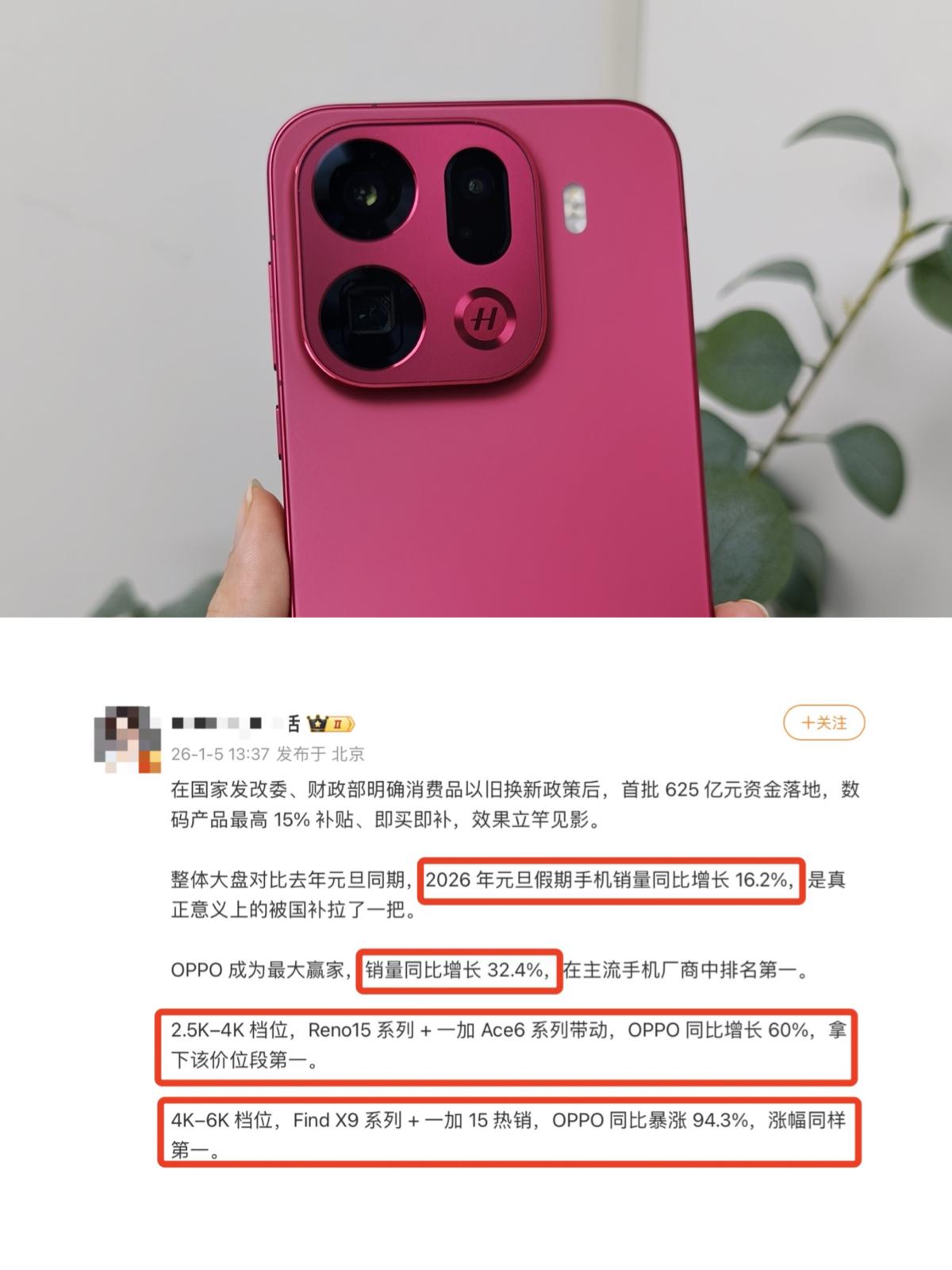 元旦假期手机卖爆了!春节假期不敢想… 元旦3天假还没缓过来😭 一看日历,春节能连休9天 假期长度直接×3,本打工人已开始倒数⌛️了 不过刚放完假,发现还挺多同事换新手机了 果然一到长假,换手机的人就巨多! 尤其是今年元旦节开启了新一波国补 手机至高➖500,手机销量自然猛猛涨,大盘上涨了16.2%🤯 zui猛的居然OPPO,以32.4%的涨幅在主流手机厂商里排名第☝🏻 看了一下,主要是Reno15和一加Ace6在2500-4000价位卖爆了 销量涨幅达到了60%,拿下份额第☝🏻 而Find X9和一加15在4000-6000高端档更夸张,直接涨了94.3% 同样也是高端档位增幅第☝🏻 只能说OPPO这新年“开门红”真的狠 不知道后面还能不能一直赢? 听说后面要发布的Find N6也很猛 有没有懂行的兄弟来分析下?