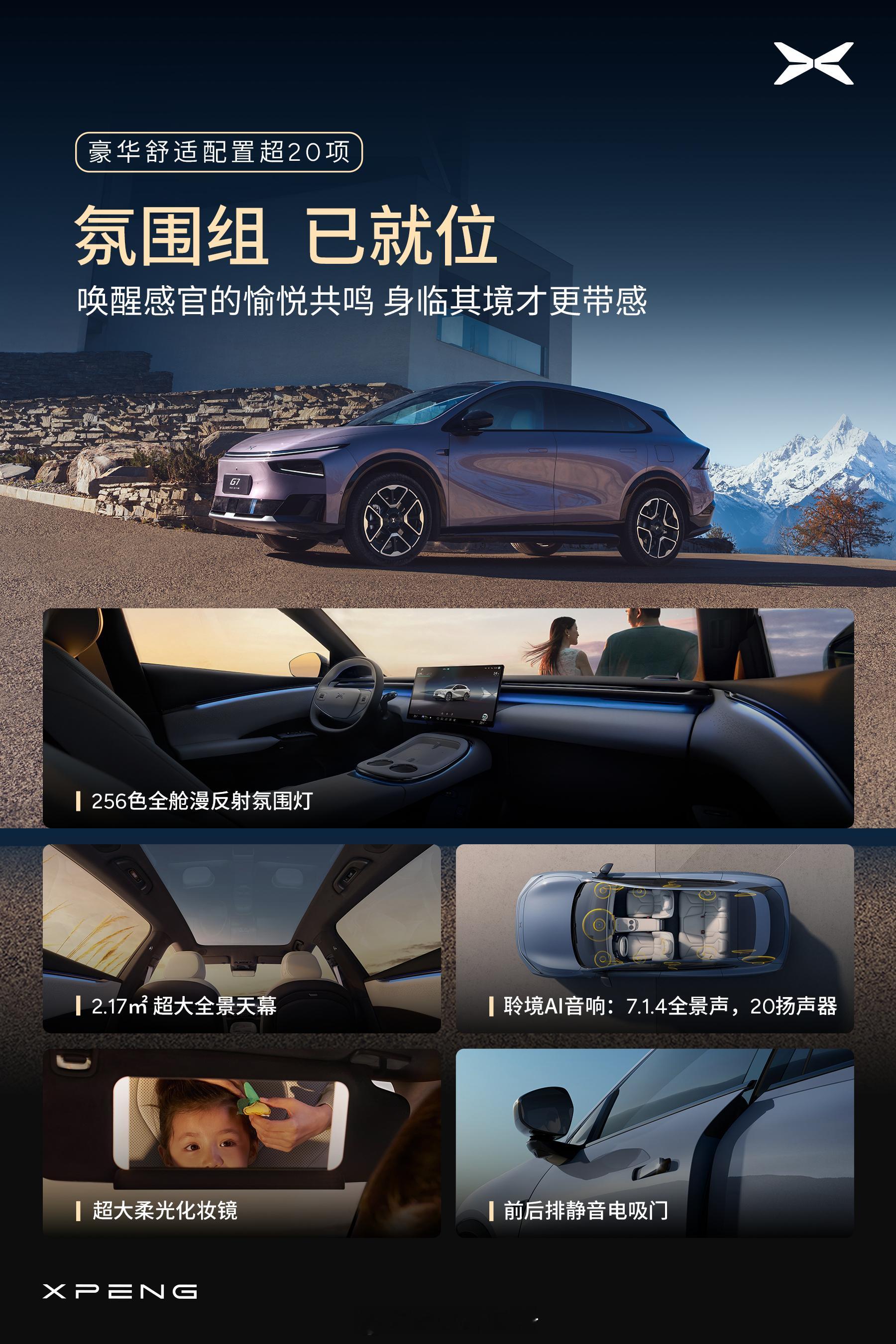 小鹏G7超级增程40万级豪华配置超20项小鹏G7超级增程超20项豪华舒适配置一部到位,从触感、体感、空间到行驶时安静与稳定,4块大屏坐哪看都好看、前排后排坐坐都是VIP、全车氛围感拉满、还有环保材质带来实实在在的安心!小鹏G7超级增程带来无与伦比的驾乘体验,让出行多一点舒心,多一点从容2026小鹏全球新品发布会定档1月8日