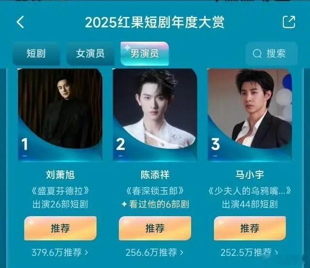 谁是短剧“顶流”?2025红果短剧大赏投票结果出来了,这个排行真的一点也不意外男演员前三:刘萧旭,陈添祥,马小宇女演员前三:郭宇欣,王格格,岳雨婷去年最火的短剧《盛夏芬得拉》直接捧出短剧届的男女顶流。不过说实话,短剧市场更新换代太快了,尤其是男演员,观众看一部爱一个,看一部又忘一个。女演员这边郭宇欣已经重新回到长剧市场了,看似放弃了在短剧里面当女主的机会,但实则这才是一条正确的路