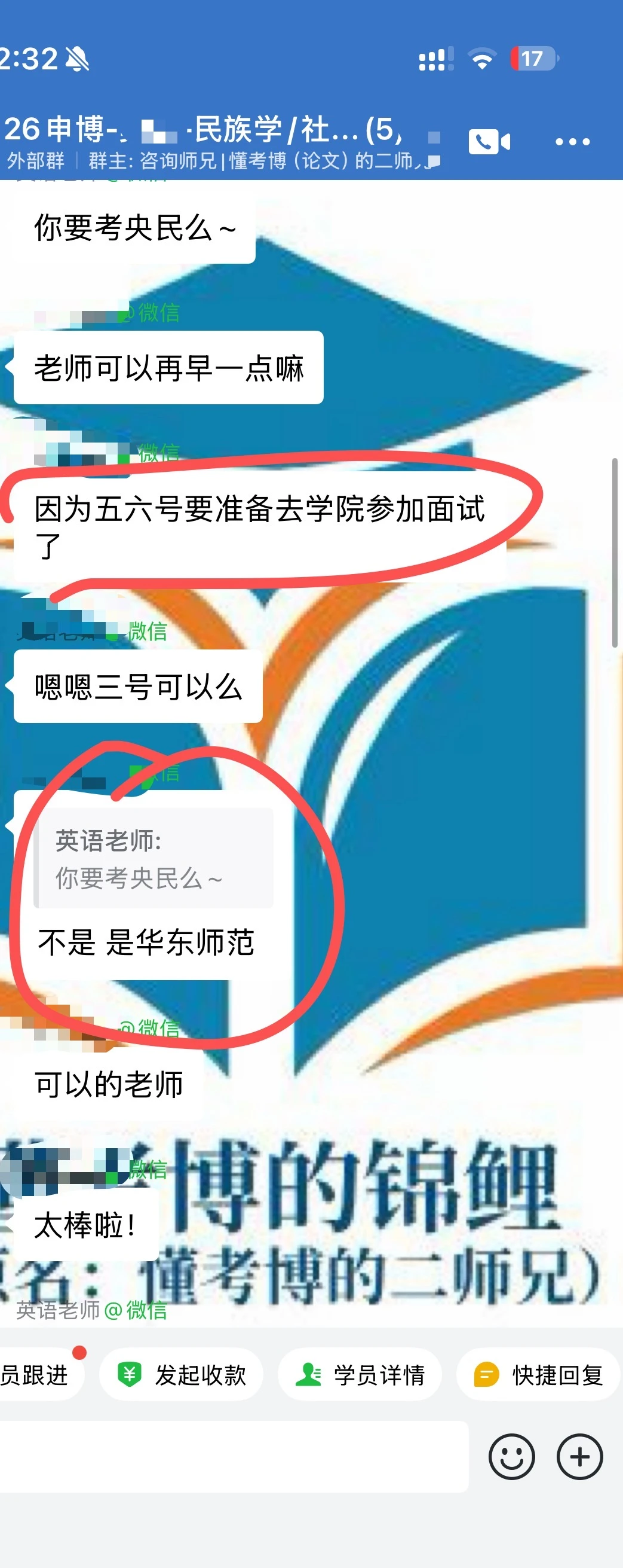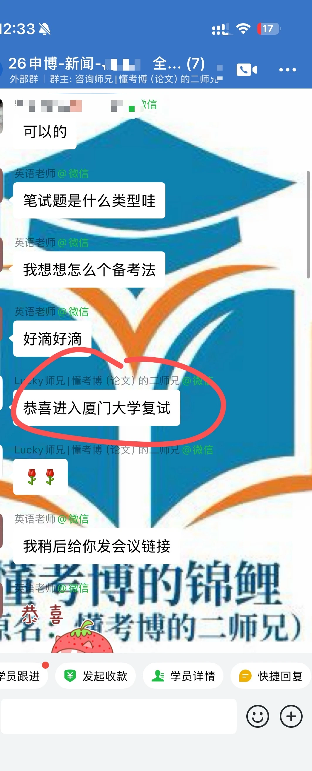 26申博7个不同学员最近好消息 经管(含数学统计):北京交通 南京农业 南京理工 厦门大学 中国人民大学 西北农林 面试 新闻:厦门大学面试 社会学:华东师范面试 12月30号报名经管申博 26申博新进学员已加武汉理工 广州大学微信