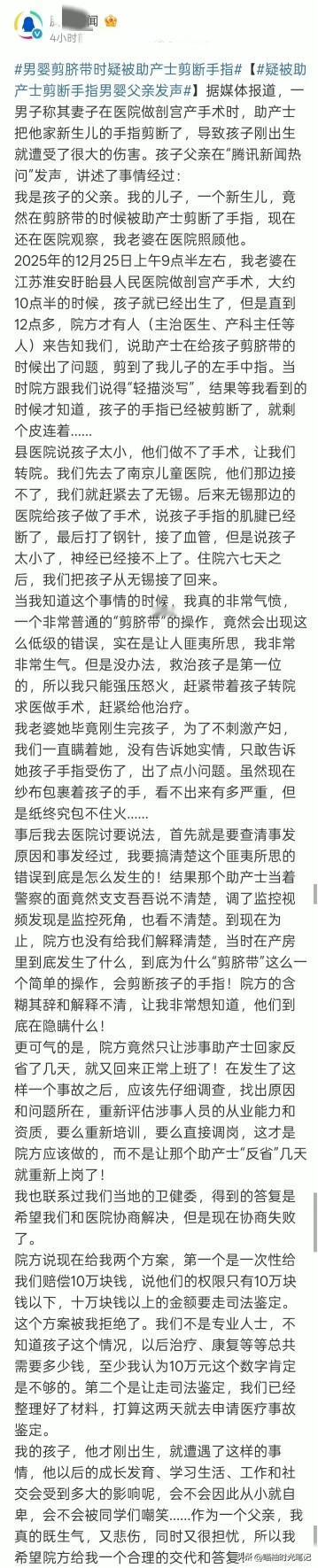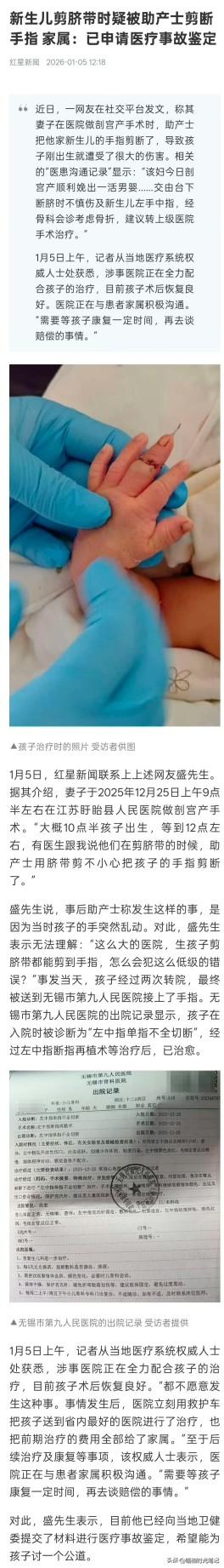 若事件属实,令人既心碎又震怒…… 剪脐本是产房最常规的操作之一,如此低级差错本不该出现。一个刚刚降临人世的小生命,尚未被拥抱就要承受钻心之痛,对孩子与整个家庭都是无法言喻的重创。 为人父母,谁不盼子女平安无恙?倘若手指再难复原,孩子面对的将不仅是肢体残缺,还有成长路上可能遭遇的心理阴影与社会目光,这些阴影或会终生相随。医疗一线系关生命,容不得丝毫懈怠。 「图源网络」