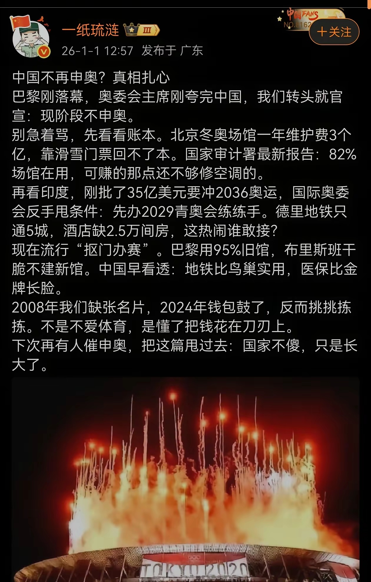 北京奥运会、冬奥会都已经给全世界证明了中国的实力,我们不再需要靠办奥运会长脸了,现阶段不申奥才是最大的智慧。