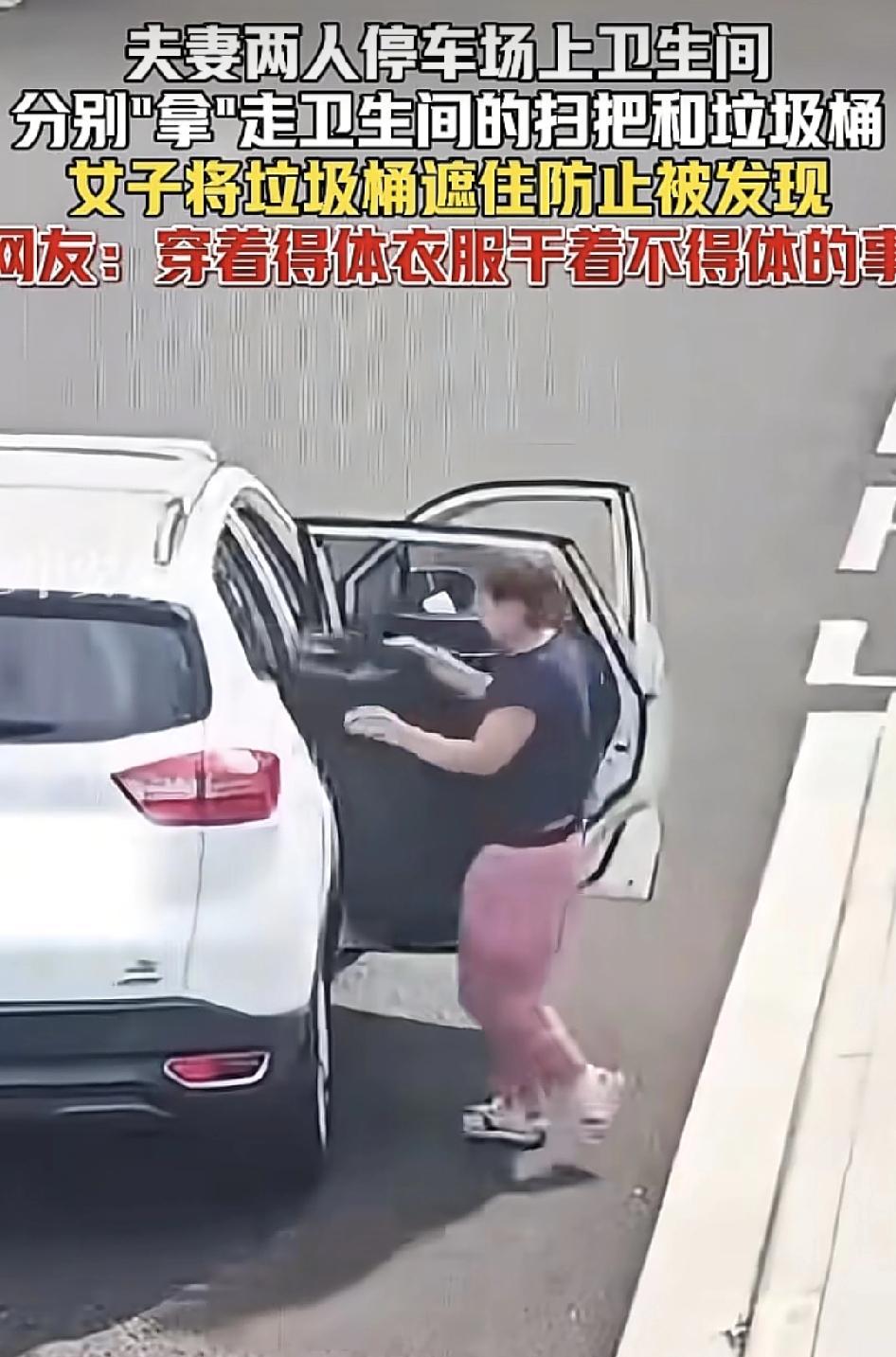 广西一对夫妻在停车场上上完洗手间之后,两人分别拿走公共厕所里的垃圾桶和扫把。女方还特意用布把垃圾桶盖着,以防被发现,但是监控把他们的行为拍得一清二楚,让网友惊呼,穿着那么得体的人,却干着这么不干净的事。试问一个垃圾桶,一把扫把能值多少钱。