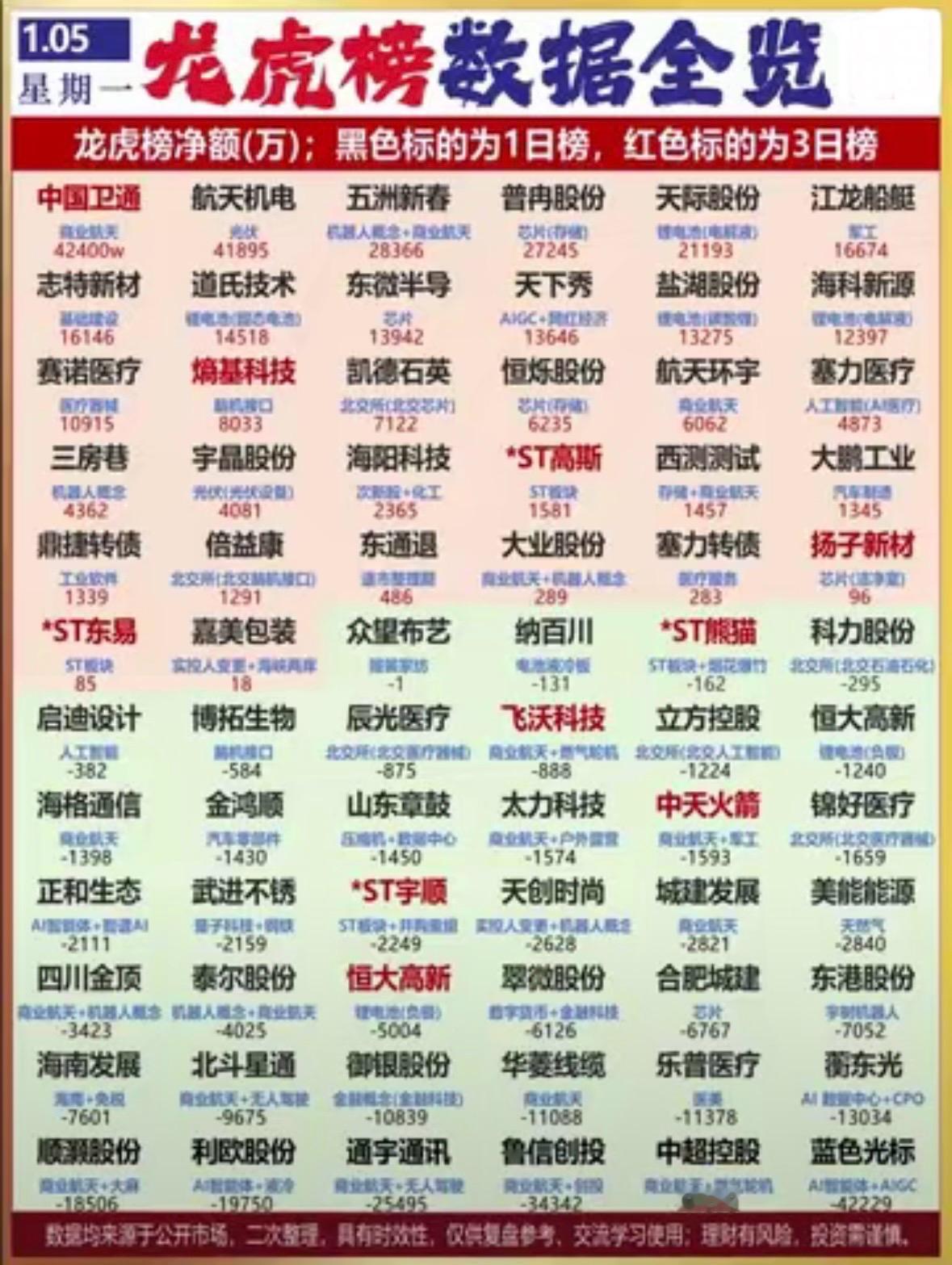 今日龙虎榜数据全览,黑红榜一目了然! 龙虎榜热点:商业航天、锂电池、芯片受资金青睐,部分个股净额显著。市场分化,投资需谨慎。