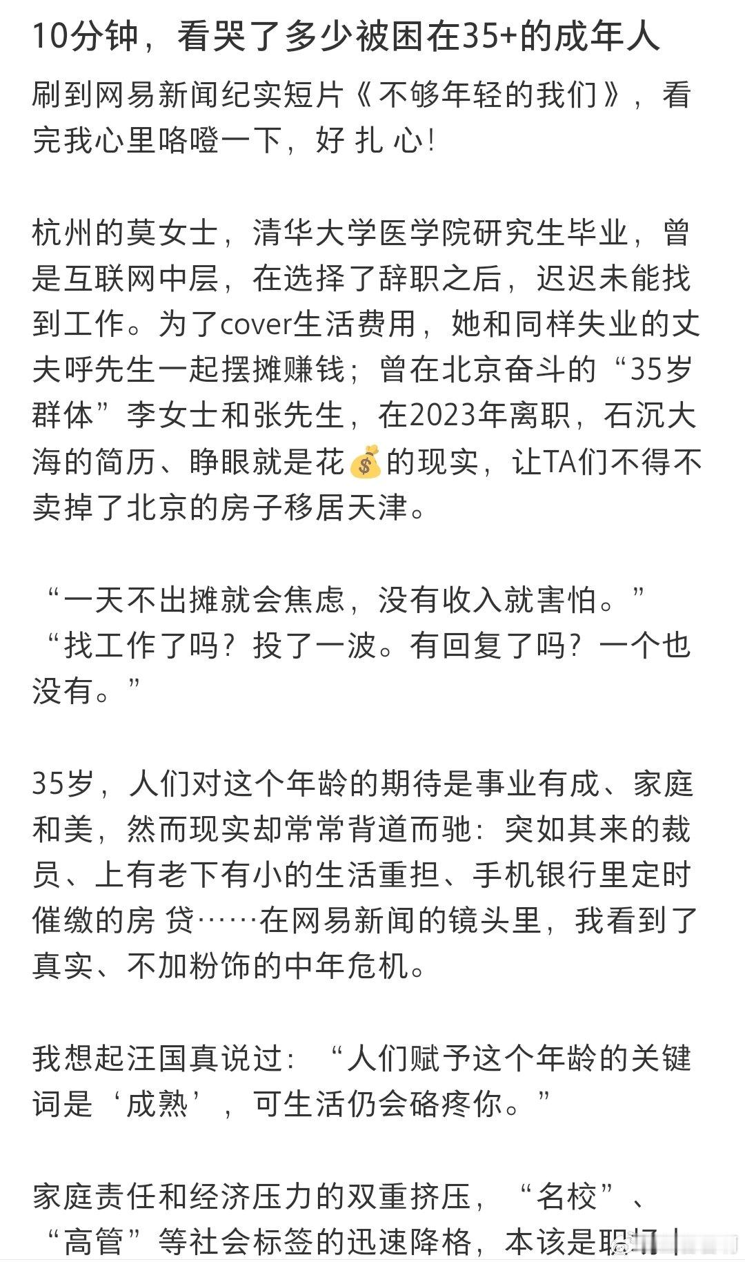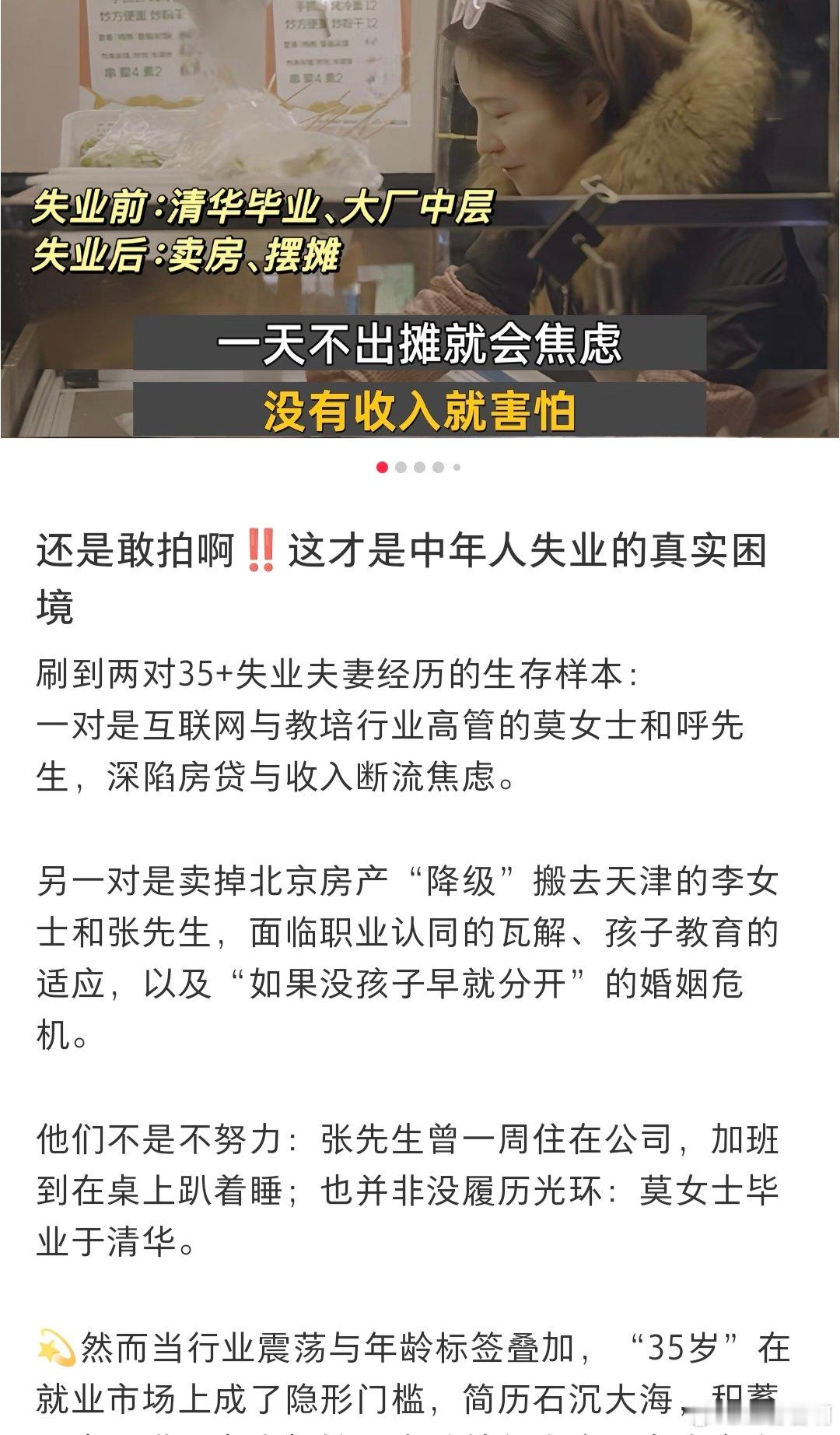 原来35岁那么刀人 35岁失业后找工作处处碰壁,高不成低不就,曾经的骄傲在现实面前碎得稀烂。上很好的大学也没过上幸福人生 失业夫妻哪有不吵架的